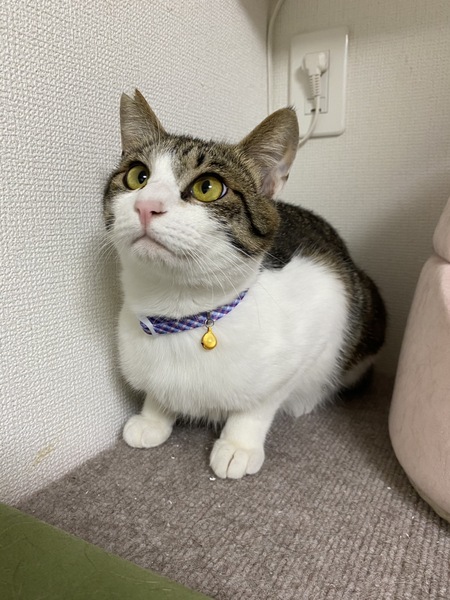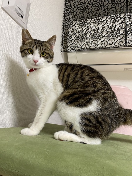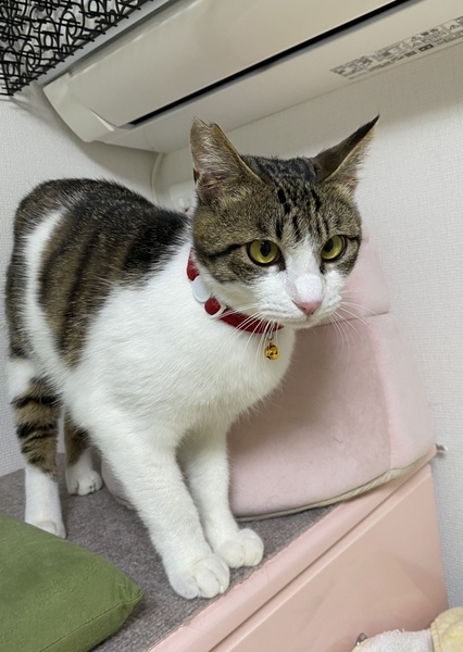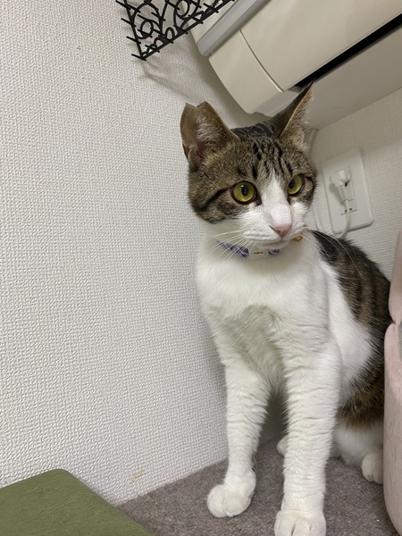 | 特徴(性格など) | キジシロ模様で尻尾は長くて真っ直ぐです。おもちゃで遊んで貰ったり、撫でられるのが大好きです。猫ちゃんのお友達にも また1匹で飼われてもお留守番も出来ます。 |