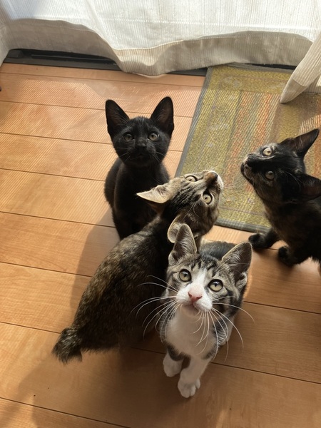 | 里親募集する理由 | 母猫が妊娠している状態で食べ物をねだっていた。声も枯れ必死だと思い保護。家の中で4匹を出産し2ヶ月を過ぎ離乳食にも慣れたので、今回里親様を募集します。 | ||