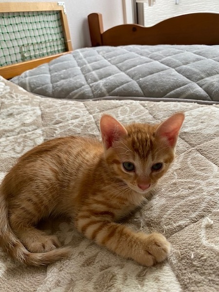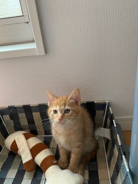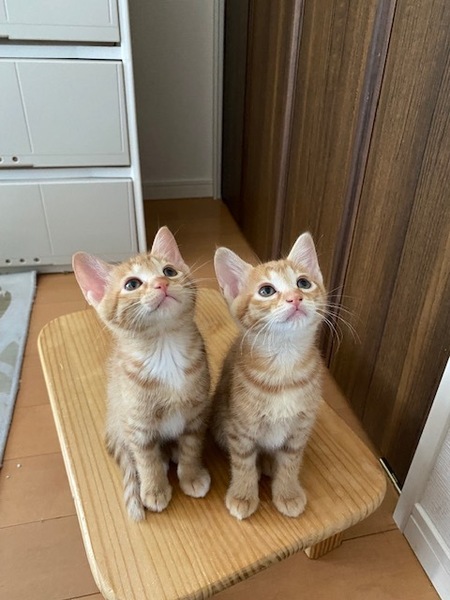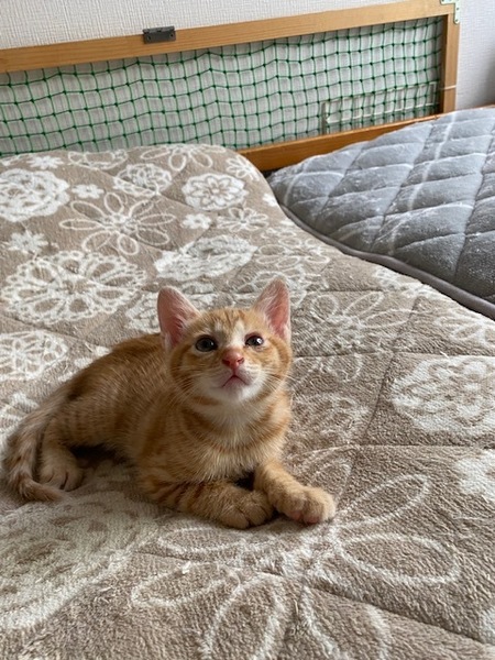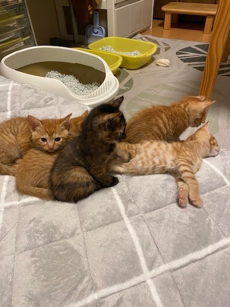 | 特徴(性格など) | 茶トラ4姉妹です。6月9日の健康診断では、特に健康上の問題はありませんでした。 まだ小さいので、FIV、FeLVの検査は未検査ですが、母猫は陰性でした。 食欲も旺盛で、離乳食も良く食べています。最近子猫用ドライフードを食べるようになりました。 トイレも粗相せずできています。 母猫に見守られながら、走り回って元気に遊んでいます。 お外にいた時から近隣住民のお世話を受けていたので、人馴れしていて初めての人にも膝に上ってきます。 |