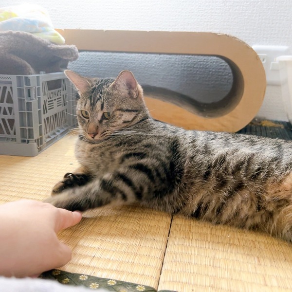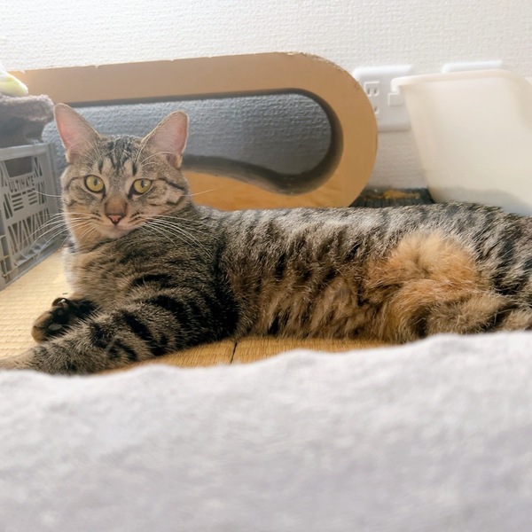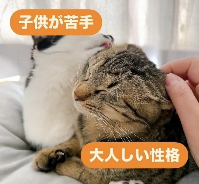 | 特徴(性格など) | ・猫同士の相性◎ ・犬との相性◎ ・子供は苦手 ・臆病で人間が少し怖い ・本当は甘えん坊で近づいてきた時に、ゆっくり話しながら手を伸ばすと撫でられます。 ・親指が巻き爪ですが、生活には支障ありません。 |