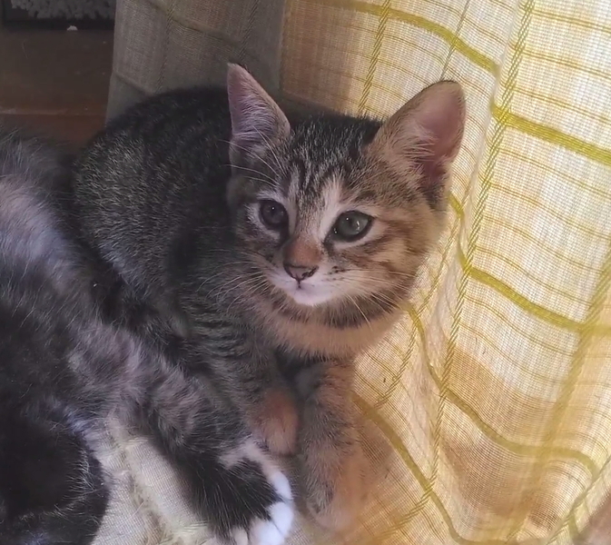 | 特徴(性格など) | きれいなキジ猫です。おとなしくて内気ですが、よく懐いて話しかけると小さな声で「ニャン」と挨拶します。 他の兄弟より発育が遅かったですが、とても元気です。 ウイルス検査、猫エイズ(FIV)、猫白血病(FeLV)ともに陰性。 |
