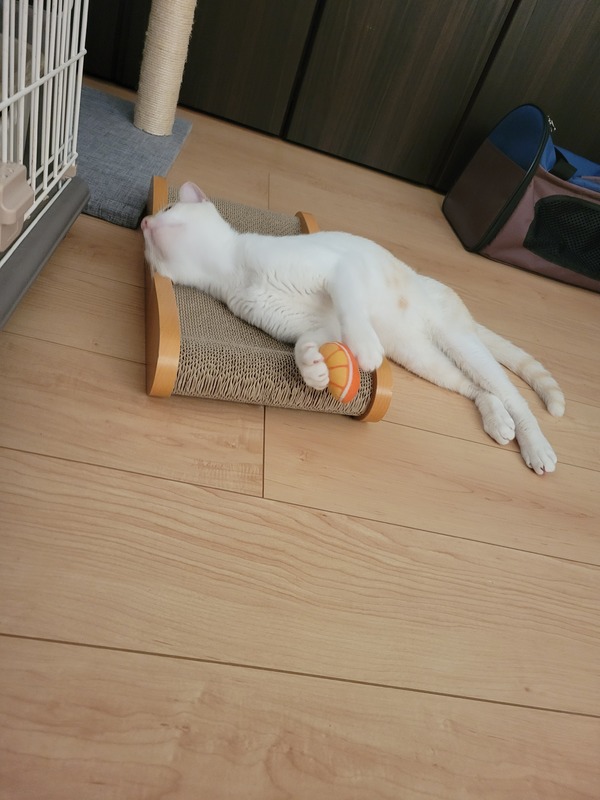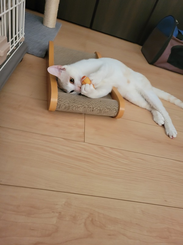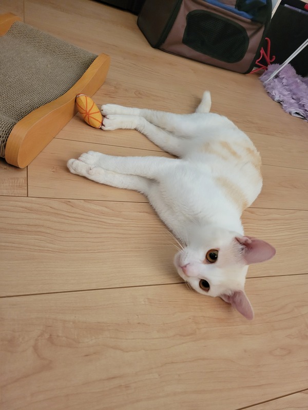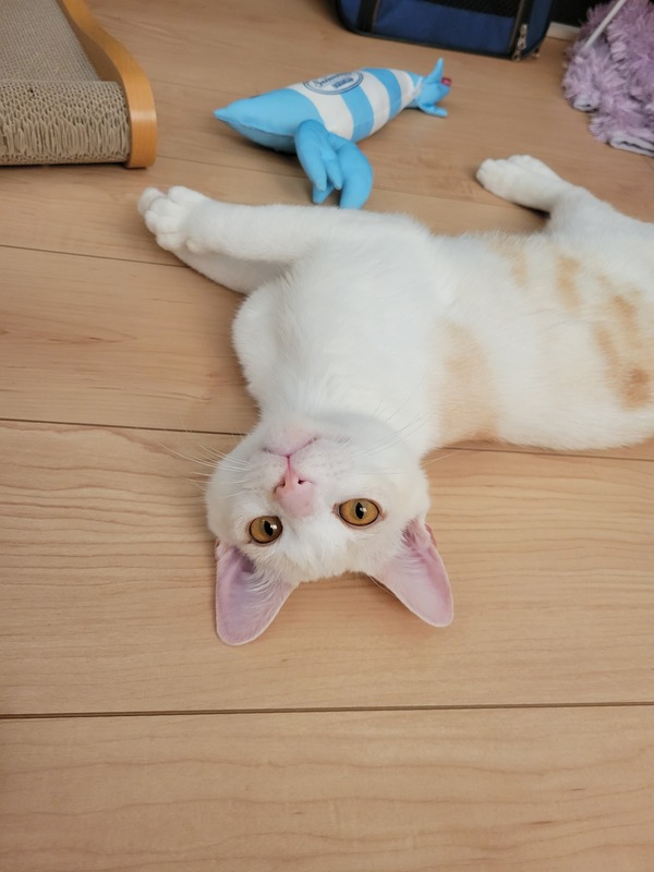 | 特徴(性格など) | びっくりするぐらい甘えん坊です! 撫でてほしくて頭を押し付けてきます。撫でるとコテンっと倒れてお腹見てせ喉をゴロゴロ(笑)とにかくくっ付いていたいようです! ちょっとドジなのか、外を見たくで窓の縁に飛び乗りますが足を踏み外す事多々(笑)爪とぎのフォームも独特(笑) クリーム色の男の子です。 |