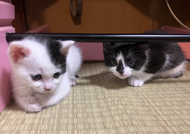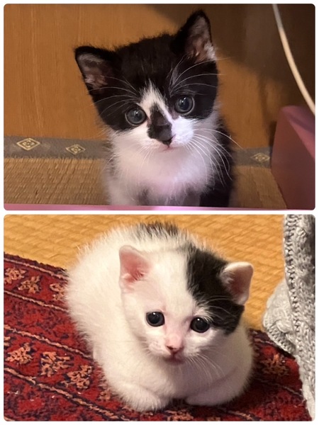 | 特徴(性格など) | 白基調:女の子 色柄:白地に黒い模様 性格:おっとり チャームポイント: ・尻尾が絶妙な長さ(ちょっと短い) ・背中に丸い模様 ・後ろ左足の背面が黒模様で、歩いた後ろ姿が可愛い ・指先、耳、鼻のゴマ模様 白を基調とした被毛に黒い模様、背中には黒い丸模様があり、その姿がとても愛らしいです。 しっぽは中途半端な長さで、その絶妙さがまた魅力的です。 顔まわりや体の模様(模様の配置など)については、お写真にてご確認ください。 黒基調:男の子 色柄:ズレたハチワレ模様 性格:活発 チャームポイント: ・尻尾の先がちょっぴり鍵しっぽ ・背中の黒地部分にゆるやかな孤を描くような白いライン模様 ・少しズレたハチワレと、鼻周りのしずく模様 黒を基調とした被毛に白い模様が入っています。少しずれたハチワレ模様と、鼻に縦に広がるしずくのような黒い模様が特徴です。背中にはゆるやかな弧を描くような白いラインがフワッと入っており、個性的でとても可愛らしい子です。 性格はとても活発で、好奇心旺盛。人のあとをついて歩いたり、動くものにもすぐに反応する元気な子です。 仲良しのきょうだい猫をペアで迎えてくださる里親さまを優先に募集します! |
