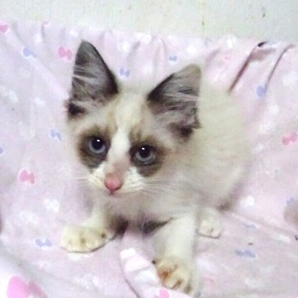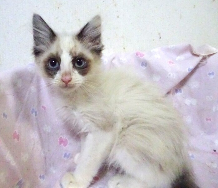 | 特徴(性格など) | 仮名: とわくん、オス 毛色: パンダもよう、ブルーアイ、淡い焦げ茶色と白の被毛、長い尻尾、まるでラグドールみたいです 性格: まだ保護して日が浅いので個性ははっきりとわかりませんが、あまり鳴きもしないし、激しい遊びもなく、大人しい性格のように思います。 保護時は食が細く、なかなか食べられませんでしたが、今は他の子と同じ位食べられます。 ご飯が来たら、あっ来た!位の反応が出るようになりました。 長毛ですが、一時期の食が細かった影響もあり、まだお腹の毛などは薄い感じですが、徐々に増えていくようです。 ラグドール風と説明して病院に行ったら、本物のラグドールじゃないですか?と言われた、まるでラグドールの子です。 穏やかな感じがするので、先住猫がいるお家でも大丈夫な気がします。 お届けは千葉市幕張から1時間圏内の千葉県でお願いしています。 検便済 駆虫済 3種混合ワクチン済 猫エイズ・白血病ウィルス検査は共に陰性です |