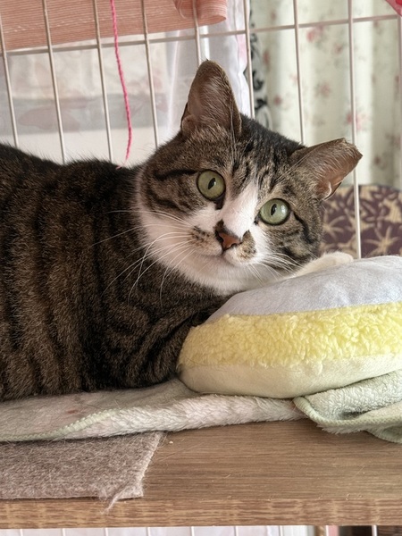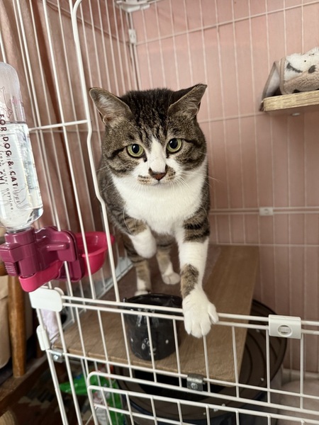 | 特徴(性格など) | くっきりきじ白 お目目は大きくて薄緑 少しぽっちゃりむっちり 性格は、ややツンデレさん 左耳先カット 顔には出さないけどさみしがりやです |