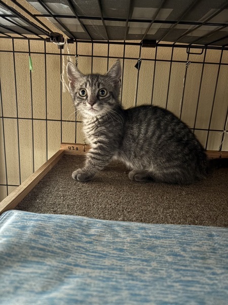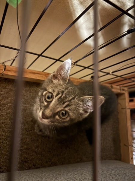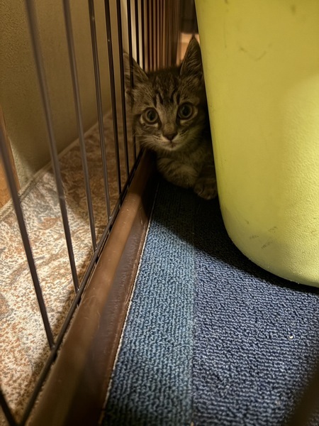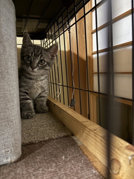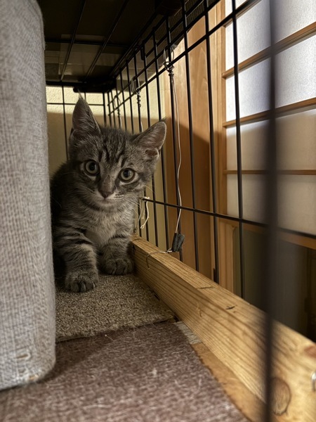 | 特徴(性格など) | グレー系トラ柄の、元気な子ねこです。保護してしばらくは人に警戒していましたが、だんだんおやつを覚えて近寄ることもできるようになりました。 先住たちがいるので甘えたりすり寄っています。少し手足が短めな風貌です。 | ||