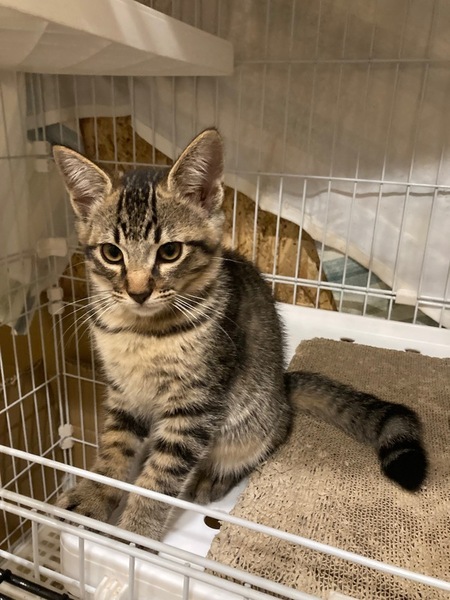 | 特徴(性格など) | 兄弟の中で一番大きいキジトラです。 しっぽの先がかぎしっぽです。 おっとりしていてちょっと怖がりですが、怖がっている兄弟をなめて落ち着かせたり、おもちゃを横取りされても譲ってあげる優しい長男です。 |