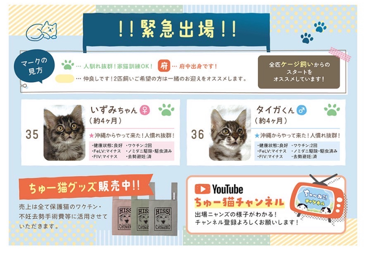 | その他(譲渡条件など) | ୨୧⌒⌒⌒⌒⌒⌒⌒⌒⌒⌒⌒⌒⌒⌒⌒୨୧ 府中駅直結⭐︎譲渡会のお知らせ ୨୧⌒⌒⌒⌒⌒⌒⌒⌒⌒⌒⌒⌒⌒⌒⌒୨୧ 【 日時 】9月7日(日)13時〜15時半まで 【 場所 】LIGHT UP LOBBY (ホテル ケヤキゲート 東京府中2F) ※混雑時は、整理券を配布。ご予約は必要ありません。 https://chuneko.exblog.jp/32603337/(会場へのご案内) ※会場への直接のお問い合わせはお控えください。 ご質問は、fuchu_nekonokai@yahoo.co.jpまで こんにちは。『NPO法人府中猫の会』です。 地元のTNR活動&保護活動(野良猫を増やさない取り組みや行き場のない猫達の保護)に尽力しているボランティア団体です。 その他にも当ボランティアの取り組みとして、地方の行き場のない猫達の保護にも力をを入れております。 今まで『熊本殺処分STOPプロジェクト』を掲げて約200匹の猫達を空輸して来ました。 そして、今現在は『沖縄プロジェクト』に着手しております。現在沖縄全土(やんばる地区や離島含む)から、たくさんの子猫達を空輸して来ております。 今回の譲渡会でご紹介する子達は沖縄っ子達ばかりが参加となります。 みんな、どの子も行き場のない子達ばかりです。 一生の家族を求めて譲渡会に出場しますのでどうぞよろしくお願い申し上げます。 ◉子猫が多頭参加します。(まだ小さな子は去勢or避妊手術ができない為、その後のアフターケアーや病院など当会でご紹介させていただきますのでご安心下さい。) ◉去勢or避妊手術をしてからお届けできる子猫達も多数おります。 ◉子猫ちゃんですが半日ぐらいはお留守番できるように躾けてあるのでご安心ください。(家中フリーになってもトイレ訓練は勿論の事、家猫訓練もパーフェクトです) ◉成猫さんに関しては、飼いやすさ抜群です!お仕事をフルタイムでお持ちのご家庭でも問題なく受け入れていただけます。 【 よくあるご質問 】 ◆猫を飼いたい。でも保護猫ってハードルが高い気がする… その点はご安心ください。出場する全ての猫達はみんな家猫訓練を受けており、トイレ訓練もパーフェクトな猫達です。 猫飼い初心者OKな猫ちゃんも多数出場します。 ◆60歳を超えているが、猫を迎えたい。 今時の60代様、70代様は、大変お若くアグレッシブでいらっしゃいます! そんな方々にはぜひ成猫さんをオススメさせていただきます。 今回出場する成猫さんは、捨てられた子達ばかりです。(多頭崩壊、飼育放棄、夜逃げによる強制執行) みんな心に傷を負っている子達を保護しております。しばらく心のケアや家猫訓練をバスした子達を出場させますので、ぜひ!会いに来てください。 ※60歳以上の方は後継人をお願いしております。後継人の方とご来場いただくと私達も選考しやすいのでよろしくお願いします。 ◆わが子の為にも保護猫を迎えたい!しかし、私達家族一同、猫を飼うのは初めてです。どうしたらいいですか? そのようなご家庭こそぜひ!お待ちしております! 猫ちゃんの魅力を知っていただきたいのと、お子様が保護猫達と一緒に育つ事により『命に優しい情操教育』となると願っている当会です。 喜んでお待ちしております。 ※猫アレルギー問題があります。初めて猫を飼う方は猫アレルギー検査を事前にしていただくと私達も選考しやすいです。 特にお子様には必ず検査をお願いします。 ◆仕事があって、お留守番をさせるのが心配… ご心配はご無用です! 今回出場する子達はみんな成猫さんなので、一日フルタイムでお仕事をお持ちのご家庭でも問題なく迎えていただける子達ばかりです。 【 譲渡会にご参加くださる方々へ 】 ₍ᐞ•༝•ᐞ₎◞ ̑̑ ◎混雑を防ぐ為、入場制限をさせていただきますが、ご予約の必要はございません。 入り口カウンターにてスタッフが整理券を配布いたしますのでご協力お願い申し上げます。 ₍ᐞ•༝•ᐞ₎◞ ̑̑ ◎初めて猫ちゃんを迎える方(特にお子様のいるご家庭)は、猫アレルギーの有無を明確にしてくださると選考しやすいです。 ₍ᐞ•༝•ᐞ₎◞ ̑̑ ◎譲渡会はお見合いのみの場となっております。 ご来場前に必ず下記の事項をご参照ください。 ▶︎譲渡会のシステムについて◀︎ https://chuneko.exblog.jp/32604872/ 【見学希望やご支援者の方々へ】 ₍ᐞ•༝•ᐞ₎◞ ̑̑ いつもありがとうございます♡ 会場には、カフェもございます。 お飲み物をご注文くださればお席にご案内いたします。(入口スタッフに一言お申し出ください。) 大変申し訳ないのですが、里親希望の方々を優先的にご案内させていただくのをご了承の上、お越し下されば幸いです。 会場では、ちゅー猫オリジナルグッズも販売しております。 普段、ネットで販売している公式グッズの現物をお手に取ってご覧いただけます。 |