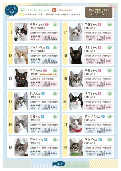 | 特徴(性格など) | 人馴れOK!猫飼い初心者OK!先住猫OK! お子様のいるご家庭OK! 子猫は遊び合って成長して行くので、2匹飼いができる環境ならば、断然2匹飼いの方が楽に育てられます!(飼い主に依存せず猫同士で遊び合って成長して行くからです。) パートタイムなど、お仕事をお持ちのご家庭は半日ぐらいならばお留守番できます。譲渡会スタッフまでご相談ください。 ~~~~~~~~~~~~~~~~~ 【性格】とにかく!かわいい!かわいい!の人懐っこくて、天真爛漫の、文句なしのスリゴロ子猫ちゃんです。 この子達は沖縄県うるま市による多頭崩壊現場出身です。 沖縄県内では、なかなかご縁に恵まれずにいたので東京に呼び寄せたというのが経緯です。 『こんなにかわいいのに…』と疑問に思う程、沖縄っ子達はみんな美猫揃いです。 今までも熊本から約200匹空輸してきた当ボランティア団体ですが、今回は初の沖縄に手を差し伸べ、沖縄から6月までに59匹空輸しております。 この子達は『沖縄っ子第4便隊』として羽田にやって来ました。 連れて来た時の様子はYouTubeにアップしておりますのでこちらをご覧ください。 ①空輸編(羽田にて) https://youtu.be/BWui3YvbxZM ②羽田から病院へ この動画の3分あたりをご覧ください https://youtu.be/HyyK5tK_hTY 【必見!】連れて来た後の様子はこちらの動画をご覧ください https://youtu.be/MgT_Ku3MjNY 文句なし!のかわいい美猫ちゃんで、直ぐに里親ご家族に溶け込んでしまうような人懐っこい子です。 ケージ訓練やフリーの家猫訓練もさせており、トイレ訓練もパーフェクトです。 飼いやすい子なので、どのような環境にも順応できます。 初めて猫ちゃんを迎えるご家庭で、特にお子様のいらっしゃるご家庭は、猫アレルギー検査の有無をお知らせくださると、私達も選考の基準となります。 60歳以上のご家庭は、息子さんや娘さんなど後継人の方を連れて譲渡会に来てくださると、私達も選考しやすいです。 【2匹飼い推奨】余裕があれば、仲良し2匹を一緒に迎える事をオススメさせていただきます。子猫はとにかく元気いっぱい!遊び合って成長して行くので2匹飼いの方が飼い主さん側は楽に育てられます。同じケージに一緒に入っている子とのマッチングをオススメさせていただきます。 とにかく!かわいい!しか言葉がありません。 自信を持って、この度の譲渡会に出場するので気になる方は会いに来てください。 よろしくお願いします |
