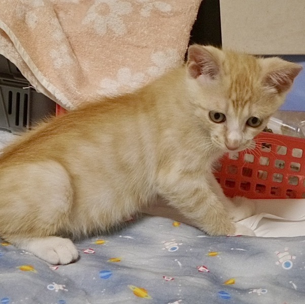 | 特徴(性格など) | 体重1.3㎏ほど 順調に成長中 5きょうだいで保護しました きょうだいの中では一番体が大きくて元気、大胆に遊んでいます ドライフードは朝、昼、晩と一日3回 薄いパステルカラーの色合いがとてもキレイ 手足の先のほうが白色になっています 猫エイズ・白血病ウィルス検査 陰性 3種ワクチン接種済み 駆虫済み |