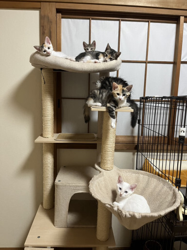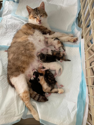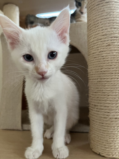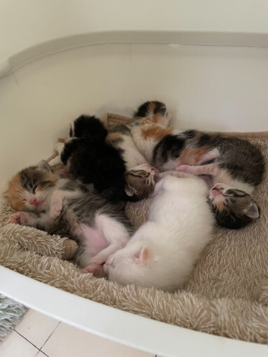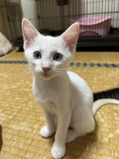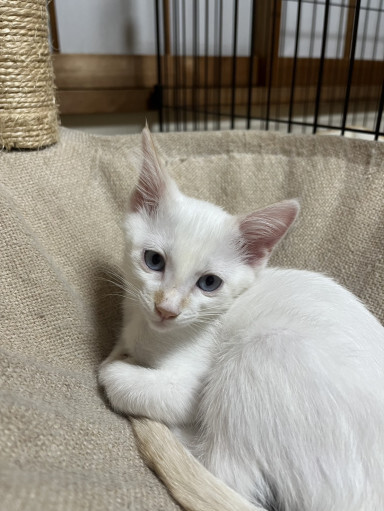 | 里親募集する理由 | クラウドファンディング真っ最中の2025/4/16にお腹の大きい猫を保護しました。 クラ子と名付けて、ベテラン預かりさんが出産を見守りました。 9時間のお産の結果、6匹兄妹の子猫が生まれました。(5匹メス、1匹オス) 最初に生まれたのは、雫ちゃん。 全身白色で尻尾と鼻の両脇が薄いきつね色 6匹の中で1番のお転婆さん すぐにゴロゴロと1番の大きな音で喉を鳴らします 人の顔を見ると1番に駆け寄ってくる人間好き! |