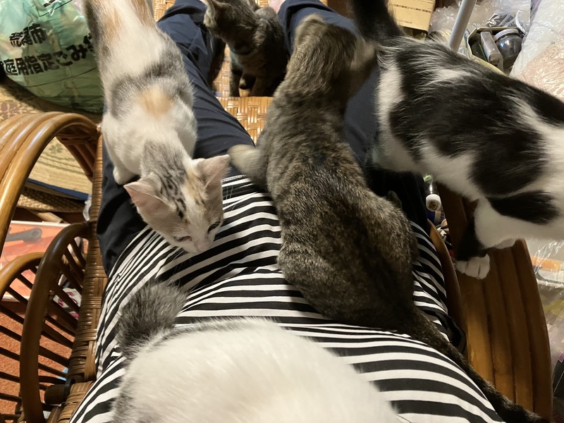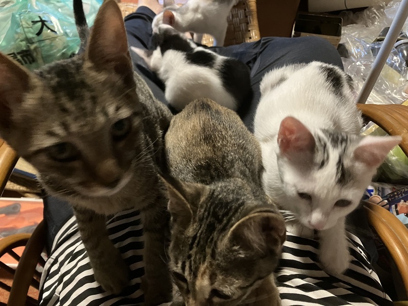 | 里親募集する理由 | ~保護経緯~ 熊本県北部の荒尾干潟近くで4月中旬に3匹のママから産まれた10人兄弟&いとこの半野良猫達。 餌やりの方の代わりに2~3匹ずつ保護していき私は5匹担当。 家猫修行と代理里親募集中です! (動画編集技術がないので未編集です…) 仮の名前付けました ①薄三毛ちゃん♀→マリンちゃん ②黒白くん♂→ランドくん ③灰白くん♂(尻尾短め)→スカイくん ④キジくん♂→ラグナくん ⑤キジサビちゃん♀→ラムちゃん |