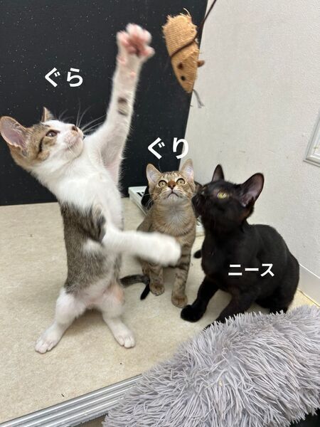 | 特徴(性格など) | 生後3ヶ月のわんぱくな男の子ニースくんです! 兄弟ねこのコナンくんと一緒にねこの森にやってきました。 ニースというお名前はフランスの美しい都市の名前からつけました✨ とにかく遊びたい盛りなお年頃、元気いっぱいの食いしん坊さんです! ニースくんは現在子猫4匹で子猫部屋で過ごしていますが、他の子達とも仲良しで一緒に遊んだりお昼寝したり過ごしています? 健康状態について 現在は猫風邪のため治療中ですが、元気いっぱいです。 追記:現在日中のみ大人たちのいる保護猫室に出てきてます!YouTubeライブ配信で元気な姿が見られるので是非ご覧ください! 当院で健康診断・各種検査(血液・便・エイズ白血病検査)を実施済みで、エイズ白血病検査は陰性です。3種混合ワクチン接種、内外部寄生虫駆除、避妊去勢手術、マイクロチップ装着等は月齢を考慮し、実施可能なタイミングで順次行う予定です。各処置の実施状況については、お問い合わせください。 |