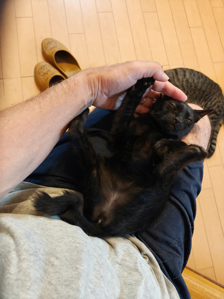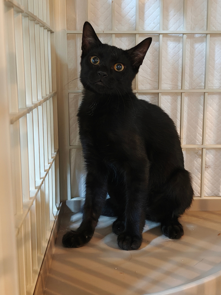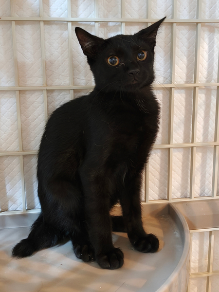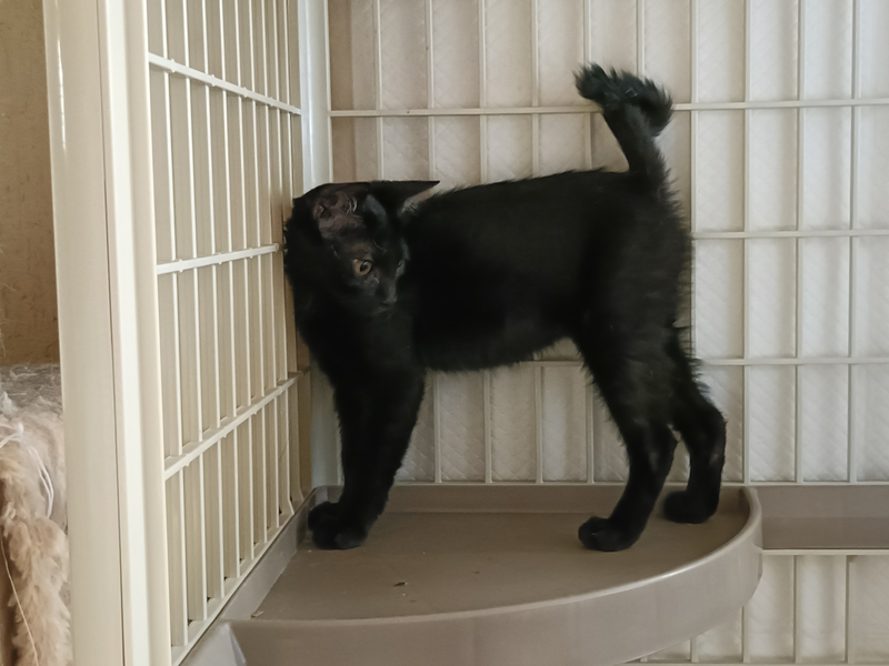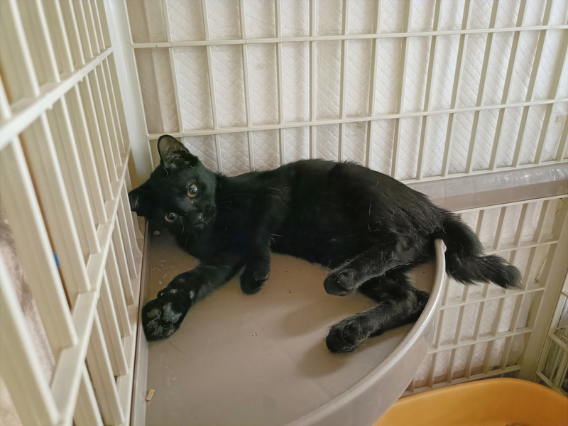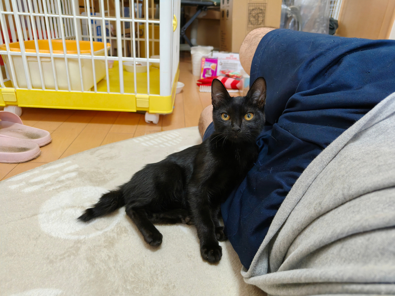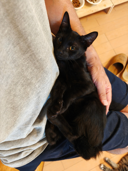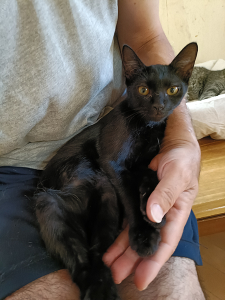 | 特徴(性格など) | 仮の名前をまめちゃんと呼んでいる、生後2か月の、ピカチュウのようなギザギザなカギしっぽのおとなしい黒猫の女の子です。 7月28日に保護、翌日には抱っこもさせてくれて3日目には喉も鳴らして甘えてくれるようになりました。 凶暴性はありません。 ガンガン甘えてくるタイプではなく、8月3日現在では真夜中はケージで寝させていますがその時だけ寂しさとケージから出たい気持ちで夜鳴きしますが、その解決も時間の問題でしょう。 現在人間との生活に馴れるため、夫婦二人のほか29匹の大人猫たちと生活しており、大人猫にも威嚇したりすることはありません。 一回目の三種混合ワクチン、血液検査、ノミ・ダニ・耳ダニはいませんが念のためおなかの中の虫下しのためネクスガードコンボの処置を動物病院で受けており、健康は全く問題ありません。 7月30日時点の体重は1.48kgでした。 |