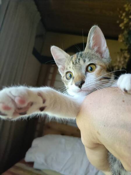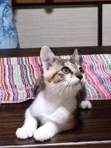 | 里親募集する理由 | 宅配ボックスの中に取り残された2ヶ月の子猫兄妹を保護しました。ノミがいたので、しっかり駆除。最初から人馴れしており、さわっても抱っこしてもきょとんとした感じでした。 今ではのどをゴロゴロ鳴らしてとてもなついています。 お兄さんが、先に譲渡できそうです、ぜひ可愛すぎるこの妹も幸せにしてあげて下さい。 |