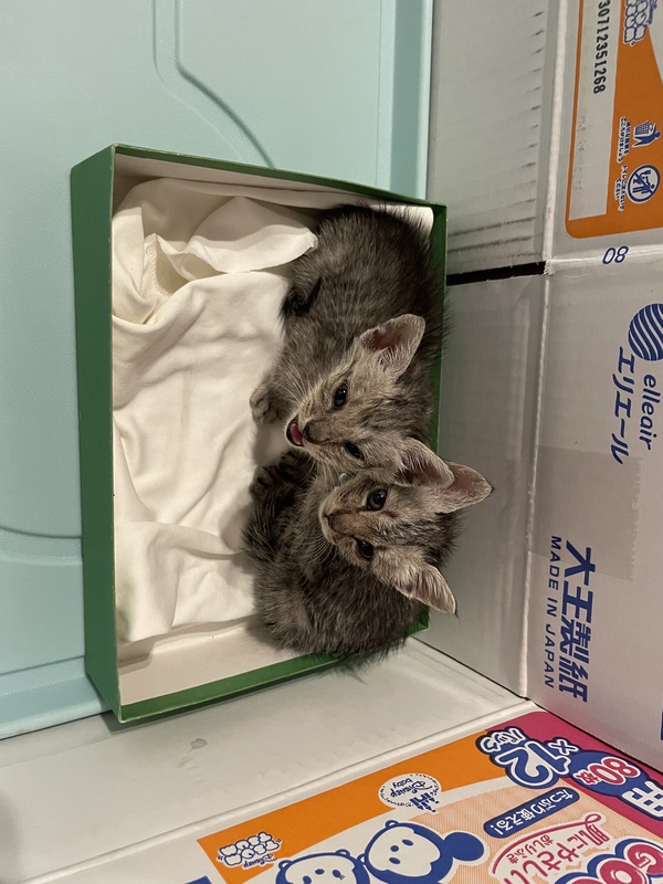 | 里親募集する理由 | 道路脇にダンボールに2匹入れられて捨てられてました。 家では先住猫がいて相性がとても悪く、一緒に飼うことが出来ないため里親を募集してます。 |