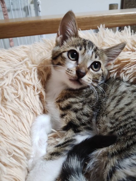 | 特徴(性格など) | 男の子は、好奇心旺盛でおっとりタイプ。 先住猫にもかわいがられており、他の猫にも物おじせず、落ち着いた性格です。 女の子は、美人さんで元気いっぱい! お兄ちゃんが大好きで、いつも一緒に遊んだりくっついたりしています。 遊ぶことが大好きで、人にもよく慣れており、何事にも動じない頼もしい子です。 2匹とも、人とのふれあいにもしっかりと心を開いてくれていて、安心してお迎えいただける性格です。 最近は、2匹でお腹を見せてへそ天で眠る姿に毎日癒されています。 毛色はキジ白ですが、少し珍しいベンガル風の模様をしており、まさにイケメン&美女の兄妹猫です。 この子たちが、これからの猫生を安心して幸せに過ごせるように—— 責任と愛情を持って迎えてくださる方を探しています。 できましたら、この仲良しな2匹がこれからも一緒に過ごせる環境でご縁がつながれば、とてもうれしく思います。 健康状態:良好(避妊・去勢済み/ウィルス検査済み/駆虫済み/食欲・排泄も安定) |