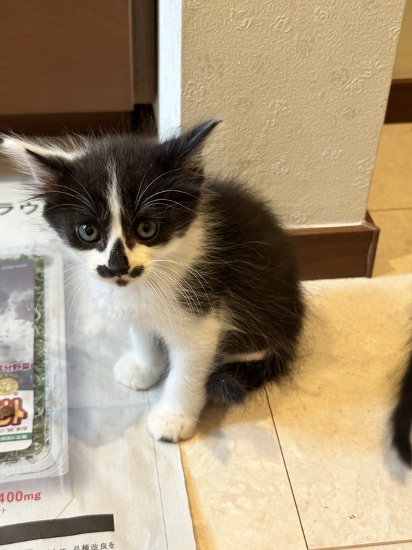 | 特徴(性格など) | 白黒柄男の子2匹います。 おとなしい性格かと思います。 カリカリ食べます。 トイレも大丈夫です。 元気な子猫ちゃんです。 |