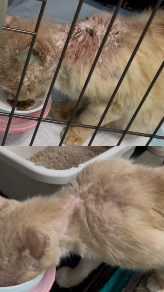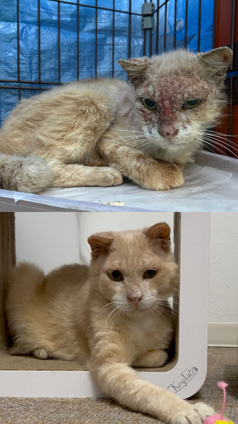 | 里親募集する理由 | 都内某所、見かけない猫がいる。しかも具合が悪そうと連絡を受け、一目見てすぐに疥癬と分かる状態だったロイズ君。 皮膚病だけではなく、飢えとも戦っていたようでした。 すぐに保護を決めて治療と人馴れ訓練が始まりました。 |