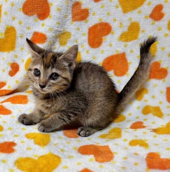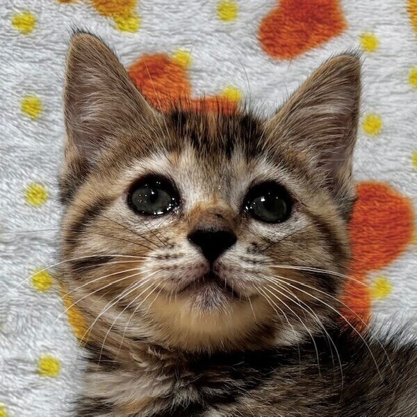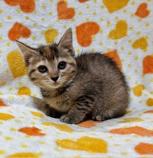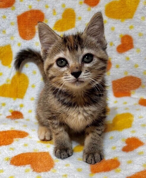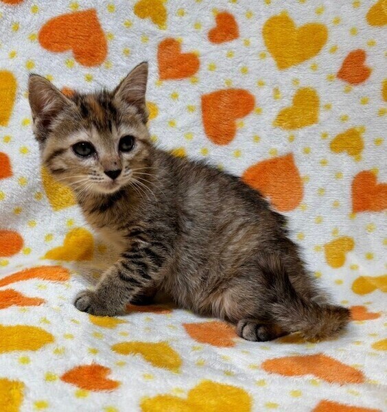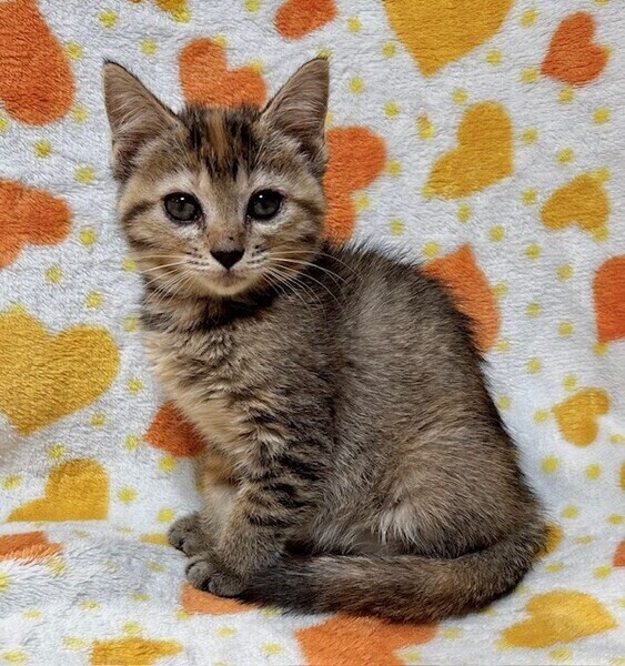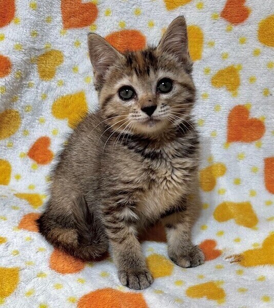 | 特徴(性格など) | 【仮名】めるるちゃん 【性格】ちっちゃいキジトラのめるるちゃん♪ 好奇心旺盛で冒険好きなおてんばちゃん! 兄妹のポムくんととっても仲良しで いつもにゃんプロしてます! 抱っこも大好きなかまってちゃんデス♪ ポムくんや同世代にゃんこと一緒の お迎えを希望します♪ ※1ピキ譲渡応相談 |
