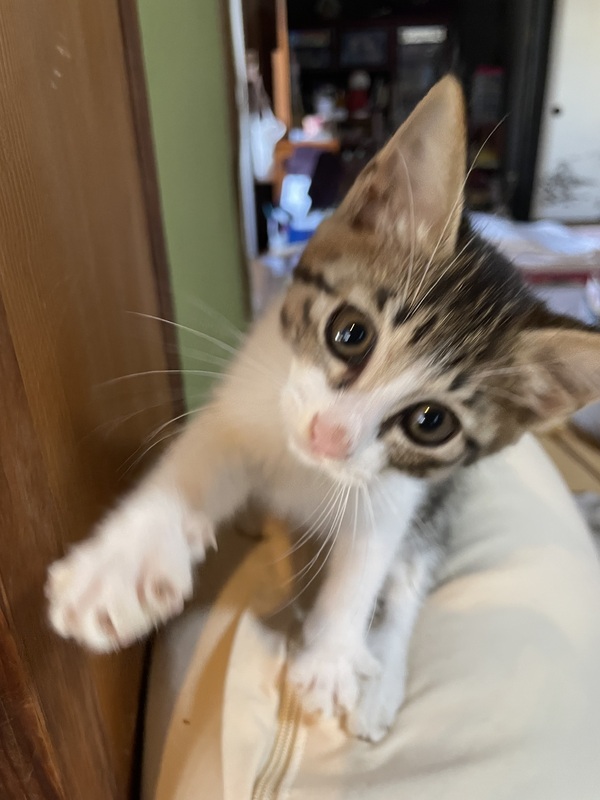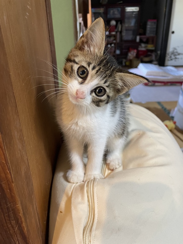 | 特徴(性格など) | キジトラの3ヶ月くらいの女の子です!! 活発でよくひとり遊びが上手で両手を使って遊んでます!!鳴き声も可愛いです!元々、犬を飼っていて仲良く一緒にいます!もの応じしない性格です! |
