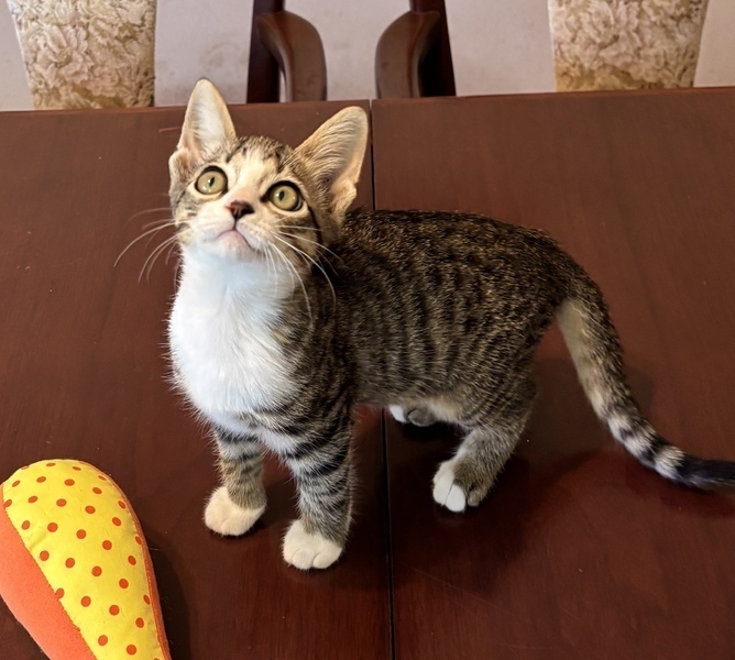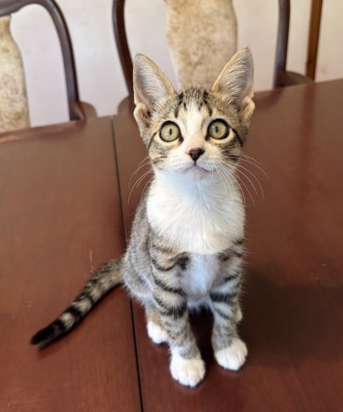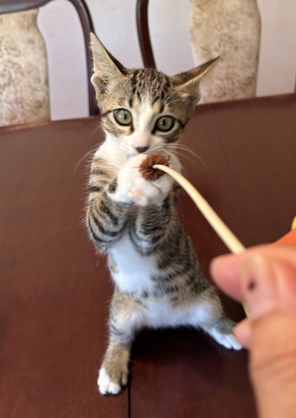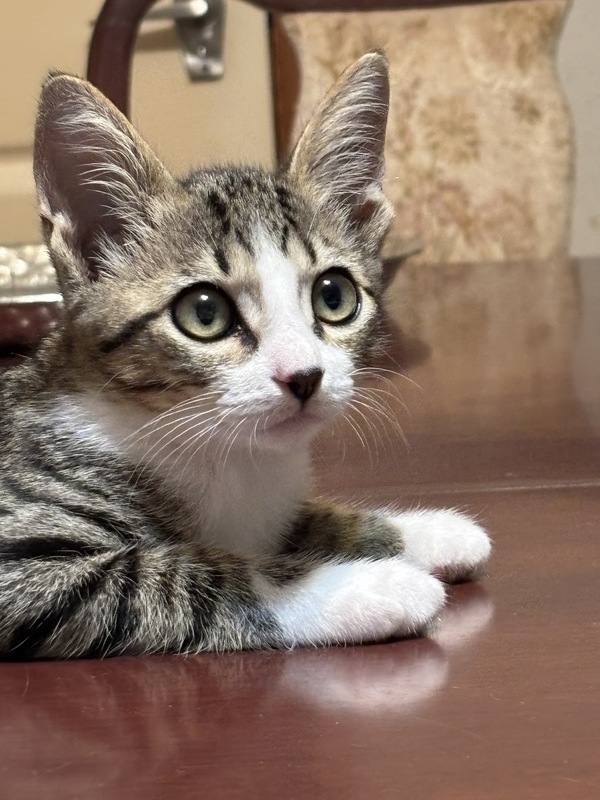 | 特徴(性格など) | お耳の大きいアイラインくっきりのキジシロです 白いソックスをはいていておなかにはベルトの様な模様があります | ||