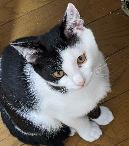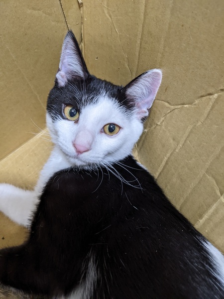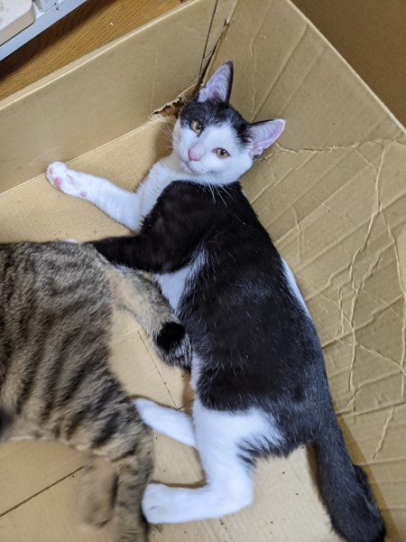 | 特徴(性格など) | 白黒トラ。背中に三日月のような白い模様があり、くるんとしたカギしっぽの子です。 生まれた時は三日月のように見えた模様が体が大きくなったら三日月に見えなくなってきました。 少し甘えんぼです。 黒い部分はよく見ると縞が入っています。 調べてみたら「黒トラはめずらしい」「大人になると消えることもある」そうです。 どんな模様の大人になるかという楽しみもある子です。 トイレはきちんとやります。 爪切りも嫌がりません。 段ボールやオモチャでよく遊びます。 名前は仮称です。かわいい名前をつけてあげてください。 |