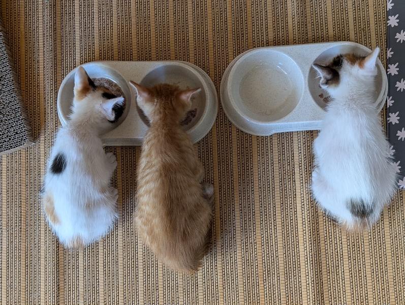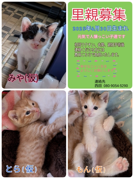 | その他(譲渡条件など) | お母さんとお兄ちゃん猫が トイレも教えてくれてます、よく食べよく遊び元気いっぱいニャンズたちにずっとのお家で楽しいニャン生をよろしくお願いします! |