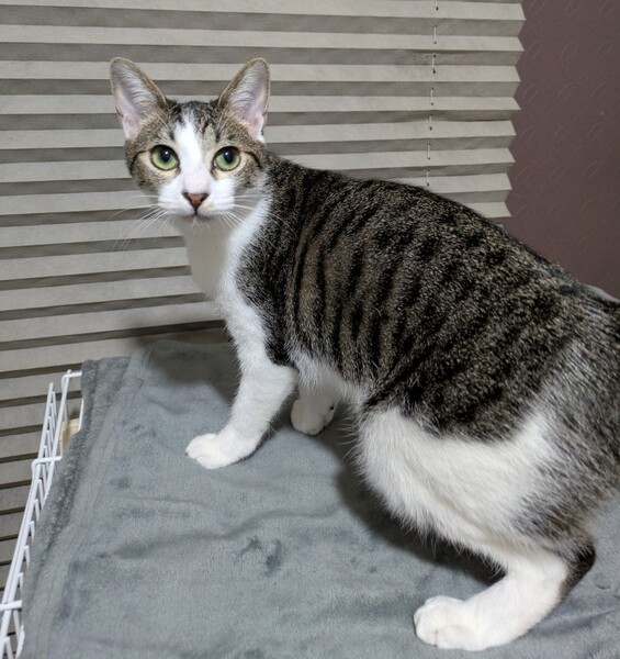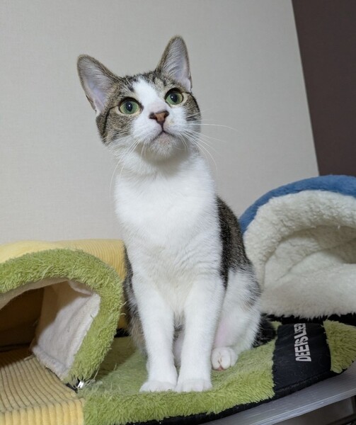 | 特徴(性格など) | 2024.5.30生まれ(推定) 毛色:キジ白 短いしっぽの美少女系キジ白ガール♡ 他の子に比べると気の強い所はありますが、とっても甘えん坊さん。 撫でで〜と頭突きしてきたり、膝の上に乗ってきたりします。 高いところが大好きで、3段ケージの上がお気に入り。 そこからみんなの様子を眺めたり、お昼寝したりしています☆ 先住猫さんのいないお家か、今過ごしている子達と複数での譲渡を希望しています。 |
