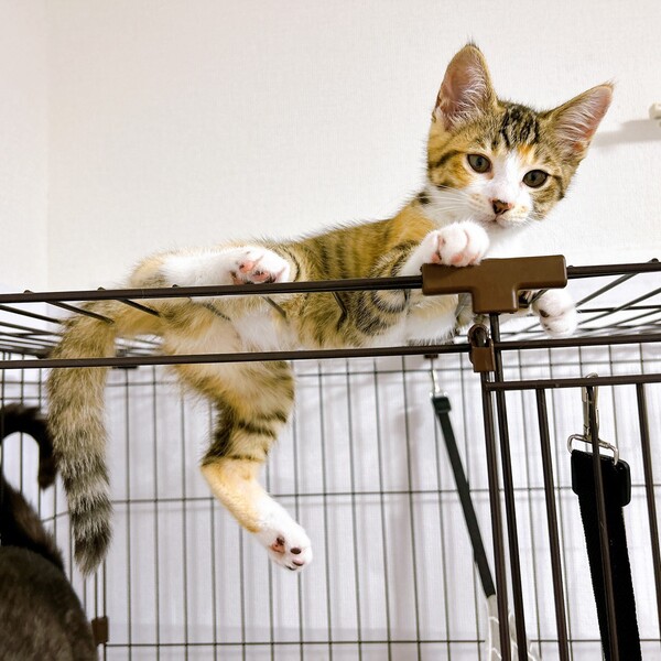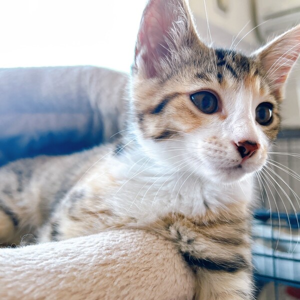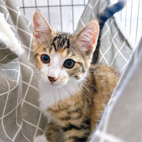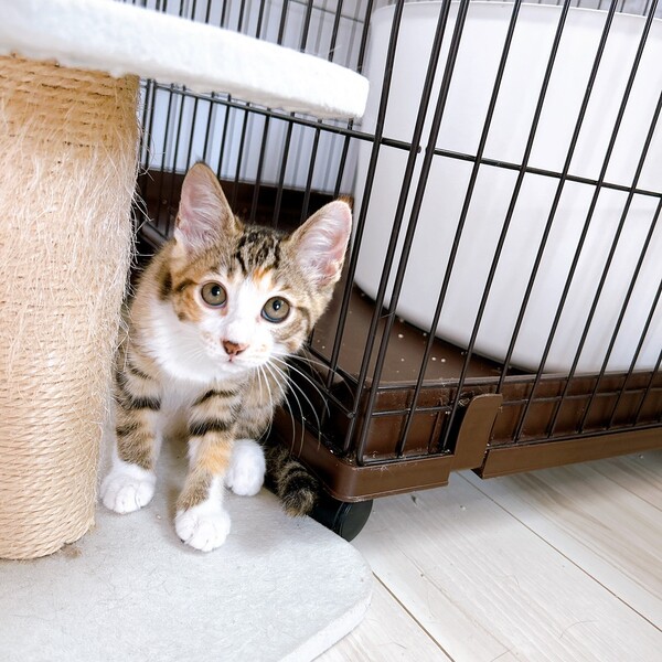 | 特徴(性格など) | 2025.5.1生まれ(推定) 毛色:三毛 自立心があって、しっかりタイプの女の子。 珍しい模様の三毛猫ちゃんです。 甘えんぼさんでお膝の上でゴロゴロが大好き。 けどマイペースなのでさっきまで甘えてたと思ったら、 1人で遊んで別の場所でまたお昼寝したりと自由気ままです。 1匹でも多頭でもうまくやれるとても器用な子でお世話がしやすいです。 |