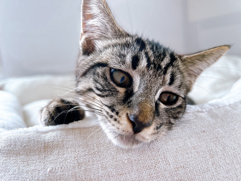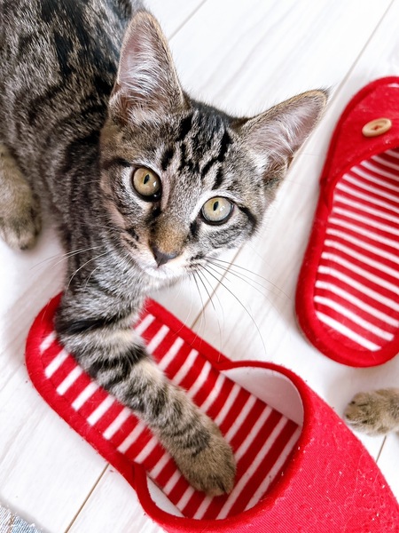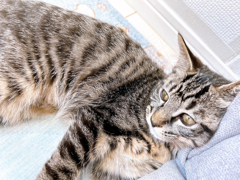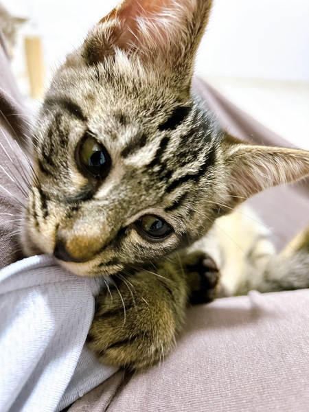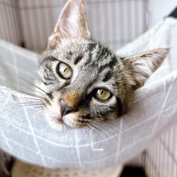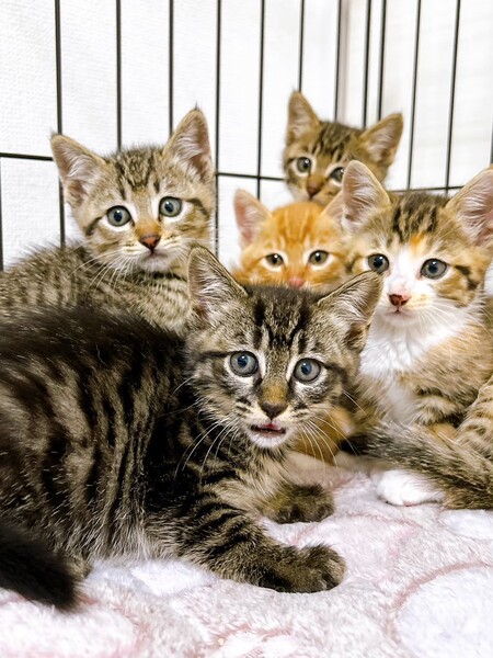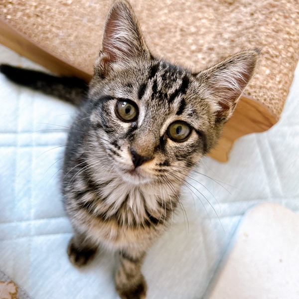 | 特徴(性格など) | 2025.5.1生まれ(推定) 毛色:キジトラ(黒) ご飯が大好きな黒キジの女の子。 兄妹の中で1番おてんばさんで、にゃんプロとおもちゃ遊びが大好き。 ひとまわり大きい子にも負けずに立ち向かいます。 けれど性格は基本的におおらかで寛容なので、猫付き合いもとってもお上手。 人には甘えんぼなのでお膝の上でなでなでされるのが大好きな可愛い子です。 |