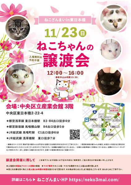 | その他(譲渡条件など) | 11:30より、2階会場入口にて受付を開始します。 受付時に入場予定時間が記入された整理券をお配り致しますので、整理券を受け取った方はお時間になりましたら2階会場入口に番号順にお並び下さい。 ※11:30より早くいらしてもお待ちいただく場所がございません。 また、近隣にお住まいの方や他階フロアのご利用者様にご迷惑となる場合がございますので、受付開始時間にあわせてお越しくださいますよう、何卒ご協力お願いいたします。 ※ねこざんまい譲渡会は、先着順で里親様を決定する譲渡会ではありません。 先に申し込みをした方を優先することもありません。 お話をして、その猫ちゃんに合ったおうちに決めさせていただいております。 12時に開場し、里親様の決定は14時以降となります。 14時以降にご入場の場合、希望の猫ちゃんが決定している可能性があります。 また1頭に対し多数のご希望をいただいた場合、早めに申し込みを締め切らせていただく場合がございますので、予めご了承下さい。 里親様決定は14時以降となります。 その後、迎え入れ準備の説明等のお時間も頂戴しますので、お時間に余裕を持ってご来場下さい。 ~~~~~~~~~~~~~~~~~~~~~~~~~~~~~~ ★仔猫ご希望の里親様★ 仔猫ちゃんたちは、まだ体がしっかりしていない赤ちゃんです。 下痢だけでも数時間対応ができなかっただけ死に至る事もあります。 その為、月齢に応じたお留守番時間を設けさせていただいております。 また、子猫ちゃん(6ヶ月未満)の里親様には子猫支援金のご協力をお願い致しております。 ★猫ちゃんとのお見合いは譲渡会で!★ ねこざんまいの猫ちゃんは譲渡会でのお見合いのみとなります。 『この子はいつ譲渡会に参加するの?』『譲渡会場の場所はどこ?』などは、ねこざんまいホームページをご覧ください。 https://neko3mai.com/ ★楽しく猫ちゃんと触れ合って★ ねこざんまい譲渡会は、猫ちゃんも里親様も保護主も笑顔で過ごせる譲渡会を目指しています。 これから20年以上、楽しい時も、悲しい時もいつも傍にいてくれる大切な家族になる猫ちゃんです。 会場には沢山の猫ちゃんがいます。 1匹1匹、触れ合って猫ちゃんとお話してください。 『初めて猫ちゃんを家族に迎える方』 『先住猫ちゃんのお友達を迎える方』など トライアルの仕方や先住猫ちゃんと仲良くなるコツなど経験豊富な保護主やスタッフにお気軽にご相談ください! 猫を愛し、そして猫に愛されている猫好きスタッフと保護主がアドバイスさせていただきます。 ★里親希望のみなさまへ★ ペットではなく、家族一員としてたっぷり愛情を注いでくださるご家庭をお待ちしております。 恐れ入りますが ●学生の方 子猫・幼猫希望の60才以上の方のみのご家庭 ●脱走防止対策にご協力いただけない方 は原則譲渡を遠慮させていただいております。 ●一人暮らし・同棲(事実婚)の方 保護主の希望や猫の年齢・性格等により、ご希望に添えない場合もございます。 参加猫ちゃんは、それぞれ保護主(実際に猫ちゃんを自宅に入れ、保護をしている方)が異なります。 詳しい条件なども異なる場合がございますので、会場内で直接保護主とお話ください。 〖共通条件〗 1.終生飼育 2.完全室内飼い 3.脱走防止対策へのご協力 4.避妊去勢手術 5.契約書類へのサイン 6.定期報告 7.医療費等の負担 当日の猫ちゃんを連れて帰ることはできません。後日、保護主が里親様のご自宅までお届け致します。 その為、移動の際の猫ちゃんの負担を月齢などから考慮し、お届け地区を限定させて頂くこともございますのでご了承ください。 ご理解とご協力のほど宜しくお願い致します。 ☆よくある質問☆ ・譲渡の条件 ・ご負担頂く費用 ・譲渡会の場所等は ホームページに詳しく掲載させて頂いておりますのでご覧ください。 https://neko3mai.com/ メールでのお問い合わせはすぐにご返答出来ない場合がございますのでご了承ください。 ホームページ https://neko3mai.com/ お問い合わせ http://www.neko3mai.com/contact/form_general.html ねこざんまいブログ http://ameblo.jp/neko3mai/ |
