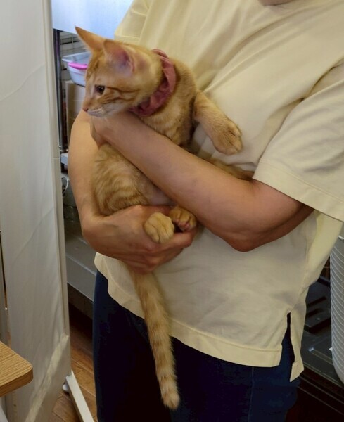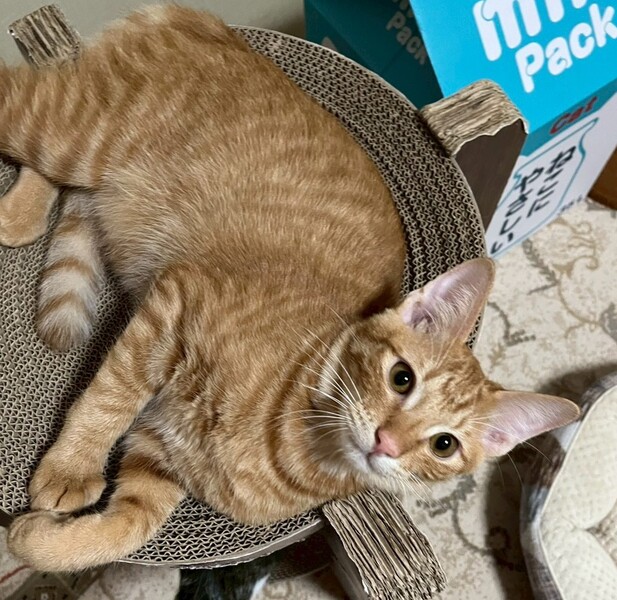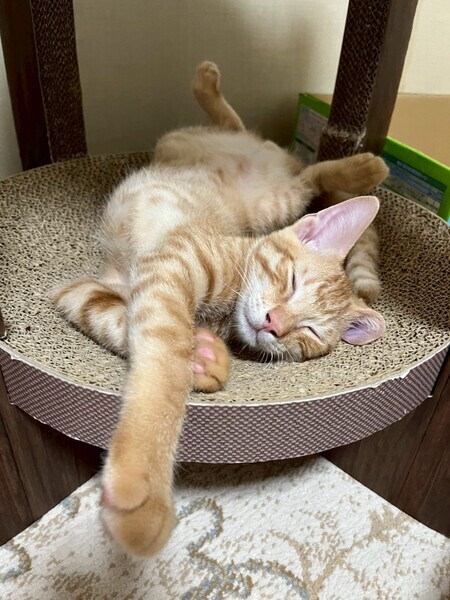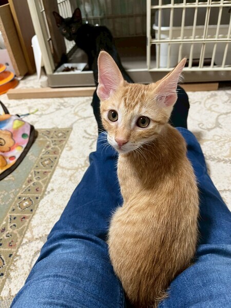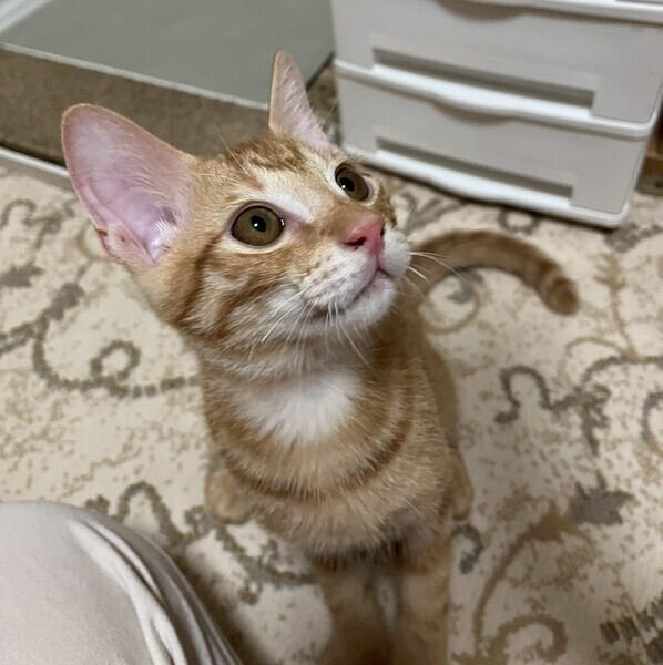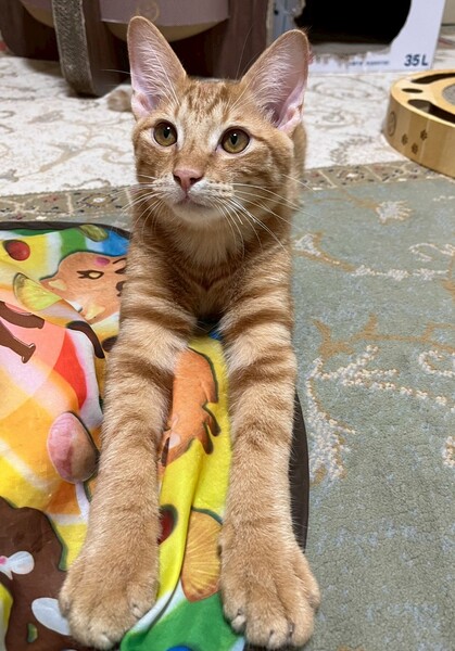 | 特徴(性格など) | 2025.4.30生まれ(推定) 毛色:茶トラ スラリと長いシッポの茶トラの男の子です。 食いしん坊で甘えん坊、ヤンチャだけどビビりです。 掃除機をかけると妹の後ろに隠れてしまいます。 最近ニャンプロを人にも仕掛けてくるようになりました。 でもおもちゃを振ると、すぐそちらに向かって行きます。 あれ?静かだな?と思うと、その辺で爆睡してます。 ゴロゴロ音がたまりません♡ |