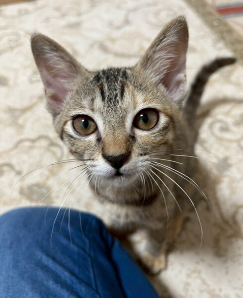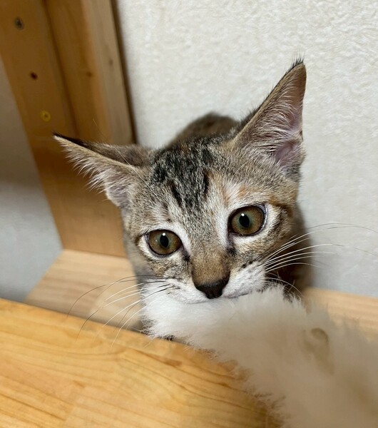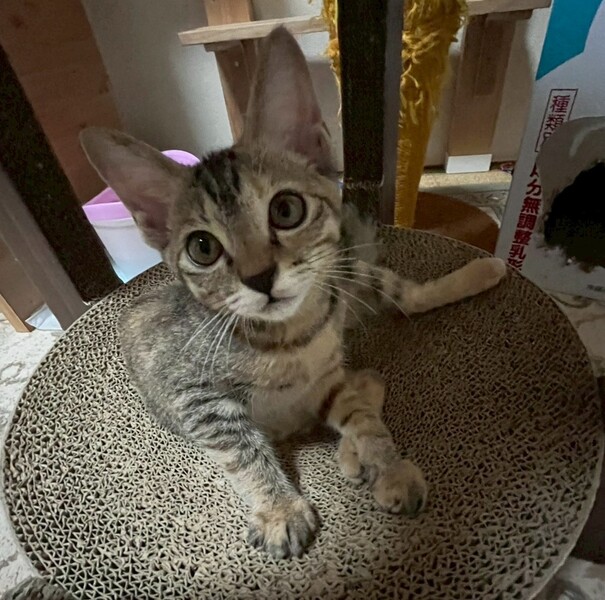 特徴(性格など) | 2025.4.30生まれ(推定) 毛色:キジトラ 姉妹兄の中で、1番の甘えん坊な麦わらの女の子♡ 目が合うと鳴いて駆け寄り、すぐにお膝に! 他の子を撫でてると間に割り込んできます。 遊ぶのも大好き♪ おもちゃが取れない時、こっち、こっち〜と可愛い声で鳴いて呼び寄せます。 他の子と遊んでると、たまに拗ねて寝たふりをする事も… でも撫でるとゴロゴロ爆音がするので、タヌキ寝入りはすぐバレます笑 |