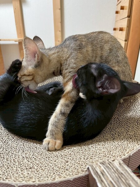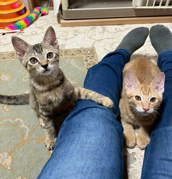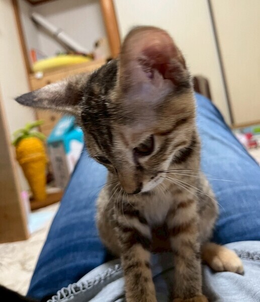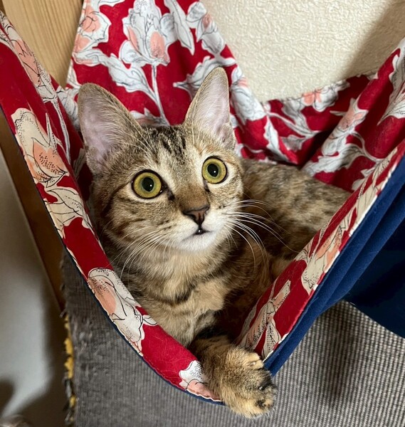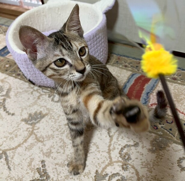 | 特徴(性格など) | 2025.4.30生まれ(推定) 毛色:キジトラ 姉妹兄の中で、1番の甘えん坊な麦わらの女の子♡ 目が合うと鳴いて駆け寄り、すぐにお膝に! 他の子を撫でてると間に割り込んできます。 遊ぶのも大好き♪ おもちゃが取れない時、こっち、こっち〜と可愛い声で鳴いて呼び寄せます。 他の子と遊んでると、たまに拗ねて寝たふりをする事も… でも撫でるとゴロゴロ爆音がするので、タヌキ寝入りはすぐバレます笑 |