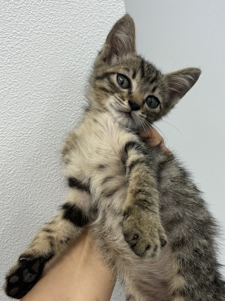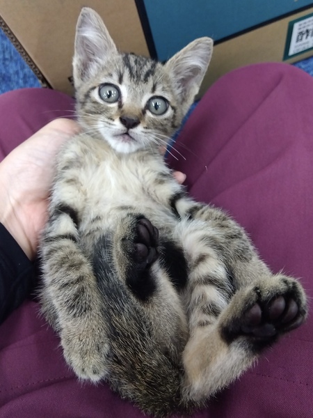 | 特徴(性格など) | 人懐こくかわいい子猫です。きれいなキジトラでご飯もよく食べます。保護時の体重は約500gで少し痩せていますが、次第に太るでしょうと獣医さんには言われました。駆虫済み。 | ||