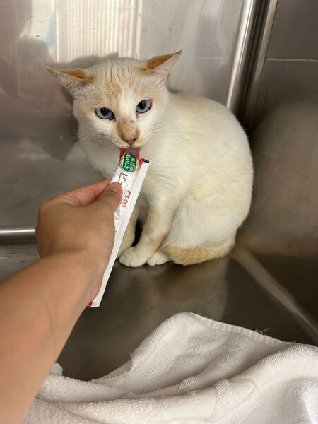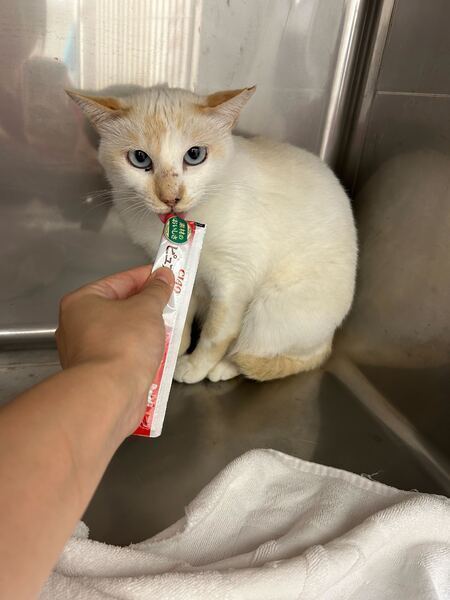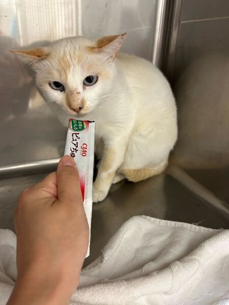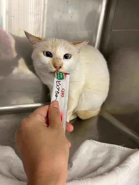 | 特徴(性格など) | 10ヶ月の可愛い女の子めめちゃんです! 怖がりさんなので現在は人慣れ修行を頑張っておりますが、少しずつ撫でさせてくれるようになってきました。 最近保護猫部屋デビューしました!YouTubeライブ配信で普段の様子を見ることができるので是非ご覧ください。 ビビリだけどちゅーるは大好き! めめちゃんの毛色はちょっと珍しい「フレームポイント(クリームポイント」✨ 体は真っ白に近く、耳、顔、尻尾など体温が低いところに色が入っているのが特徴です!この特徴を持つ猫ちゃんは青い美しい瞳がとっても綺麗! 恐らくですが、シャム猫の血が入っていると思います。 健康状態は良好です! ぜひ愛らしいめめちゃんに会いにきてください! 院長がメメちゃんを紹介してくれました!ぜひ動画をご覧ください! https://youtube.com/shorts/6zGS3GHodkU?feature=share https://youtube.com/shorts/ef0gNA_YNrc?feature=share |