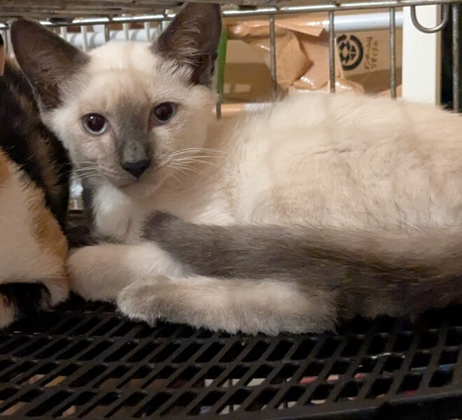 | 特徴(性格など) | シャム柄 白系 ブルーの瞳 大人しい性格です。 臆病ですが触れます。小さいですが 必要な検査をして 去勢したばかりです。 |