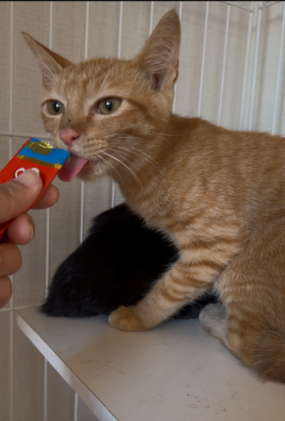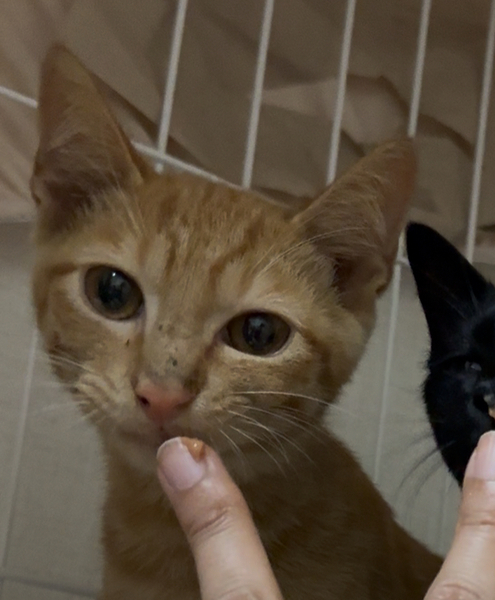 | 特徴(性格など) | 茶トラ、健診時の体重1.62kg 7兄妹で仲良く助け合って生きてきた保護猫です。まだ人慣れ修行中で撫でられたり、急に近づかれると怖がりますが、とっても優しい男の子です。 指につけたチュールを直で食べてくれます。 カリカリもよく食べるようになりました。 |