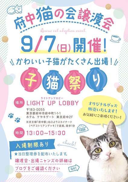 | その他(譲渡条件など) | ୨୧⌒⌒⌒⌒⌒⌒⌒⌒⌒⌒⌒⌒⌒⌒⌒୨୧ 府中駅直結⭐︎譲渡会のお知らせ ୨୧⌒⌒⌒⌒⌒⌒⌒⌒⌒⌒⌒⌒⌒⌒⌒୨୧ 【日時】9月7日(日)13時〜15時30分(受付) 【場所】LIGHT UP LOBBY (ホテル ケヤキゲート東京府中2F) ※混雑時は、整理券を配布。ご予約は必要ありません。 ※会場への直接のお問い合わせはお控えください。 ご質問は、fuchu_nekonokai@yahoo.co.jpまで 会場へのアクセスこちら☞https://youtu.be/jxn2O6sdyOk こんにちは。『NPO法人府中猫の会』です! 地元のTNR活動&保護活動(野良猫を増やさない取り組みや行き場のない猫達の保護)に尽力しているボランティア団体です。 その他にも当ボランティアの取り組みとして、地方の行き場のない猫達の保護にも力をを入れております。 今まで『熊本殺処分STOPプロジェクト』を掲げて約200匹の猫達を空輸して来ました。 そして、今現在は『沖縄プロジェクト』に着手しております。現在沖縄全土(やんばる地区や離島含む)から、たくさんの子猫達を空輸して来ております。 今回の譲渡会でご紹介する子達も沖縄っ子達が多く参加します。 みんな、どの子も行き場のない子達ばかりです。 一生の家族を求めて譲渡会に出場しますのでどうぞよろしくお願い申し上げます。 ◉子猫が多頭参加しますが、殆どの子猫が去勢or避妊手術後にお届けとなり、尚且つ家猫訓練を終えてからのお届けとなる為、お留守番はできます。お仕事をお持ちのご家庭はご相談ください。 ◉小さめの子猫は家猫訓練などパーフェクトです。お留守番時間などをご提示いただき、去勢や避妊に関しては、全面的にバックアップさせていただきますのでご安心ください。 ◉子猫ちゃんですが半日ぐらいはお留守番できるように躾けてあるのでご安心ください。(家中フリーになってもトイレ訓練は勿論の事、家猫訓練もパーフェクトです) ◉成猫さんに関しては、飼いやすさ抜群です!お仕事をフルタイムでお持ちのご家庭でも問題なく受け入れていただけます。 【 本気で猫ちゃんを飼いたい方必見! 】 譲渡会についてのシステムはこちら https://ameblo.jp/team-rose-cats/entry-12894250807.html 【 よくあるご質問 】 ◆猫を飼いたい。でも保護猫ってハードルが高い気がする… その点はご安心ください。出場する全ての猫達はみんな家猫訓練を受けており、トイレ訓練もパーフェクトな猫達です。 猫飼い初心者OKな猫ちゃんも多数出場します。 ◆60歳を超えているが、猫を迎えたい。 今時の60代様、70代様は、大変お若くアグレッシブでいらっしゃいます! そんな方々にはぜひ成猫さんをオススメさせていただきます。 今回出場する成猫さんは、捨てられた子達ばかりです。(多頭崩壊、飼育放棄、夜逃げによる強制執行) みんな心に傷を負っている子達を保護しております。しばらく心のケアや家猫訓練をバスした子達を出場させますので、ぜひ!会いに来てください。 ※60歳以上の方は後継人をお願いしております。後継人の方とご来場いただくと私達も選考しやすいのでよろしくお願いします。 ◆わが子の為にも保護猫を迎えたい!しかし、私達家族一同、猫を飼うのは初めてです。どうしたらいいですか? そのようなご家庭こそぜひ!お待ちしております! 猫ちゃんの魅力を知っていただきたいのと、お子様が保護猫達と一緒に育つ事により『命に優しい情操教育』となると願っている当会です。 喜んでお待ちしております。 ※猫アレルギー問題があります。初めて猫を飼う方は猫アレルギー検査を事前にしていただくと私達も選考しやすいです。 特にお子様には必ず検査をお願いします。 ◆仕事があって、お留守番をさせるのが心配… ご心配はご無用です! 今回出場する子達はみんな成猫さんなので、一日フルタイムでお仕事をお持ちのご家庭でも問題なく迎えていただける子達ばかりです。 【 譲渡会にご参加くださる方々へ 】 ₍ᐞ•༝•ᐞ₎◞ ̑̑ ◎混雑を防ぐ為、入場制限をさせていただきますが、ご予約の必要はございません。 入り口カウンターにてスタッフが整理券を配布いたしますのでご協力お願い申し上げます。 ₍ᐞ•༝•ᐞ₎◞ ̑̑ ◎初めて猫ちゃんを迎える方(特にお子様のいるご家庭)は、猫アレルギーの有無を明確にしてくださると選考しやすいです。 ₍ᐞ•༝•ᐞ₎◞ ̑̑ ◎譲渡会はお見合いのみの場となっております。 ご来場前に必ず下記の事項をご参照ください。 ▶︎譲渡会のシステムについて◀︎ https://chuneko.exblog.jp/32604872/ 【見学希望やご支援者の方々へ】 ₍ᐞ•༝•ᐞ₎◞ ̑̑ いつもありがとうございます♡ 会場には、カフェもございます。 お飲み物をご注文くださればお席にご案内いたします。(入口スタッフに一言お申し出ください。) 大変申し訳ないのですが、里親希望の方々を優先的にご案内させていただくのをご了承の上、お越し下されば幸いです。 会場では、ちゅー猫オリジナルグッズも販売しております。 普段、ネットで販売している公式グッズの現物をお手に
