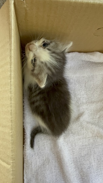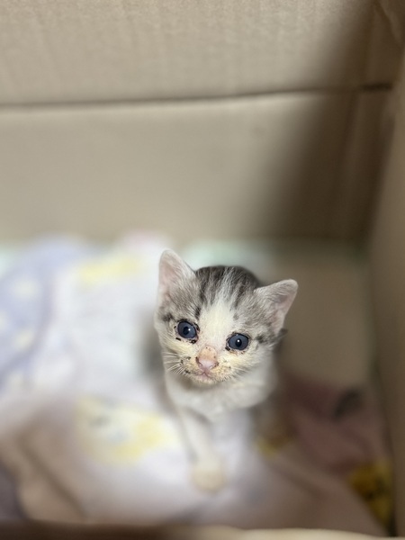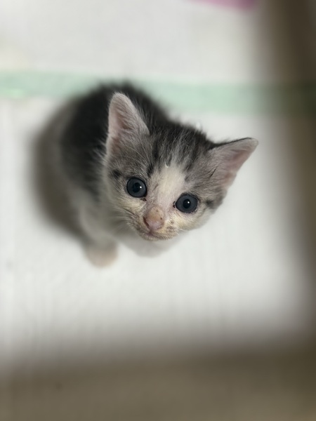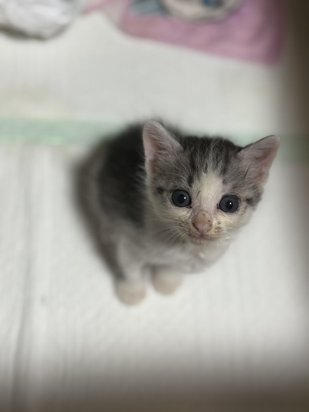 | 里親募集する理由 | 9月2日火曜日 自宅の敷地内で発見しました 道路側の外の物置のコンクリートの下あたりに挟まるような形でいたので、思わず保護しました。 当日中に体を自宅の中で洗い動物病院にも受診しました。猫風邪をひいていたので、その治療として注射をしていただいたのと内服薬をいただきました。また体重測定も病院内で行って232グラムでした。 母猫や兄弟も近くにおらず、母親の育児放棄と判断し、募集させていただいた次第になります。 |