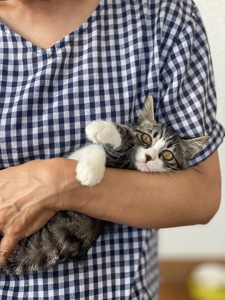 | 特徴(性格など) | 性格 保護数日間は人間に対して警戒心があるようで、ケージに近寄ると(隔離期間中のためケージ内で生活中)シャーシャーしていましたが、1週間も経つと警戒心も溶けたようです。 抱っこも爪切りも大人しくさせてくれます。 特徴 ・サバ白 ・鼻の模様 ・まん丸お目目 活動記録はInstagramにて更新中 アカウント https://www.instagram.com/hskwannyanrescue ID検索 hskwannyanrescue | ||