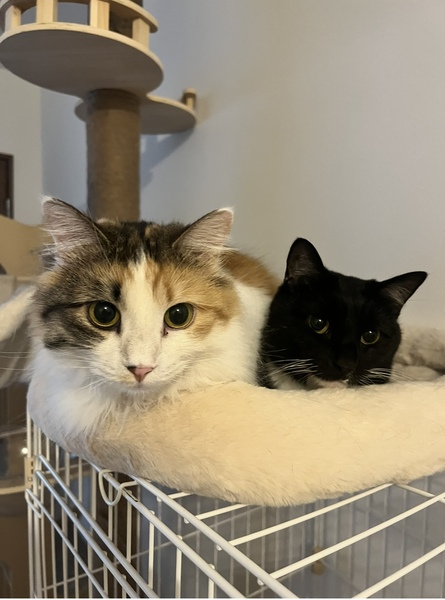 | 特徴(性格など) | 黒猫(母猫)と三毛猫(娘猫、ミヌエットのMIX)です。 母猫の方は、生まれつき左腕が欠損しておりますが、階段もキャットタワーも登れるくらい生活に支障はありません。 母猫は控えめな性格で、娘猫は甘えたさんです。 |