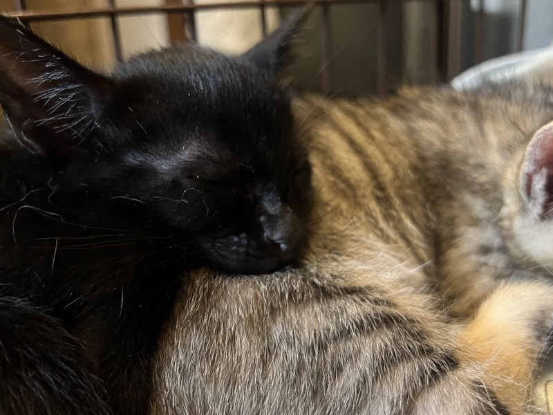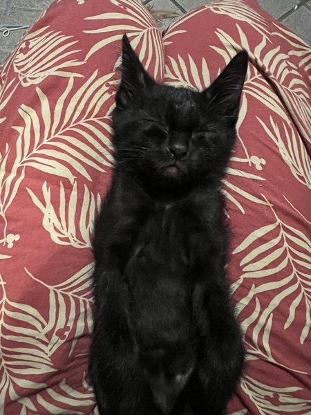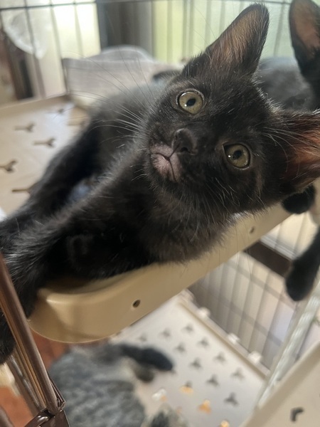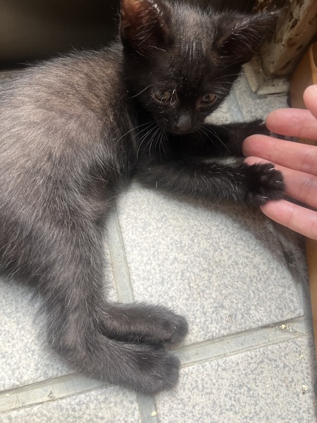 | 特徴(性格など) | お口の周りの毛がちょっと薄いのが何とも言えず可愛いです。子猫らしく遊ぶ時は元気いっぱいですが、基本はよく寝てのんびりした性格です。人にも慣れていて、顔を近づけるとペロペロなめてくれます❤️ 毛色は黒ですが、少し茶色がかっています。光があたると。うすくとら模様が見えます。 |