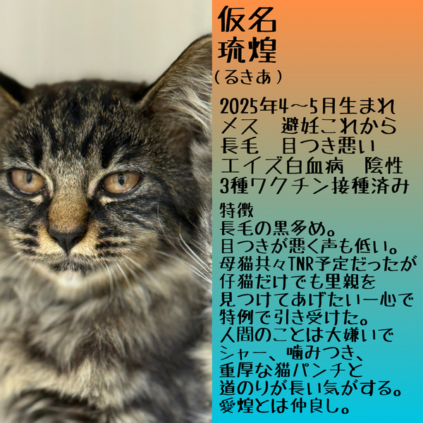 | 特徴(性格など) | 仮名:琉煌(るきあ) 名前の由来とかは公式ホームページブログをご覧ください。 https://wix.to/2hXHArd 人間不信です。シャーシャー怒ってばかりです。 全く人慣れしておりません。 噛みついてきますが子猫なので大したダメージは無いですが、ピラニアのようです。 飛ぶ、跳ねる、暴れる…動物病院行くだけでも大変です。 が、ルックスは非常にいいです。 姉妹の愛煌(あきら)と常に一緒におり、仲が良いように見えますがご飯の時は奪い合いをしています。 子猫らしい一面もあり、鈴の入ったボールで遊ぶのが好きなようです。 |