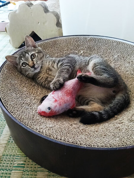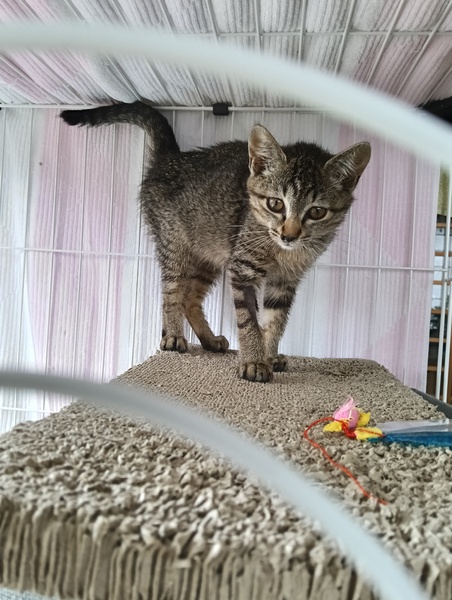 | 特徴(性格など) | 【色柄】キジトラ 【性格】明るくて元気!猫の言葉翻訳機があるのなら間違いなく第一声は「遊んでー!!」 遊び疲れるとぺとりと足に粘ったりして甘えてきます。膝に乗ることも。抱っこをすると喉を鳴らします。 初めての人にはびびりちゃんですが慣れてきて安心すると甘えん坊になる子です。 明るくとっても元気な子なので初めての猫を迎える方や犬がいるご家庭におすすめです。 教育してくれる先住猫ちゃんだと相性がいいかもしれません。 パワフルなわんちゃんにも対応できそうです。 |