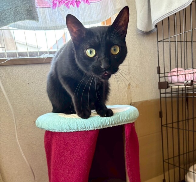 | 特徴(性格など) | 2023.5.12生まれ(推定) 毛色:黒 まんまるお目目のクロネコ男子。 甘えん坊さんでおしゃべりです 少しビビリですがナデナデすると寝転んでエアーふみふみします ブラッシングも大好きで、嬉しいときは短めのしっぽをピンと立ててプルプルします 猫じゃらしで遊ぶとたまーにジャンプしますよ♪ |