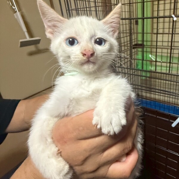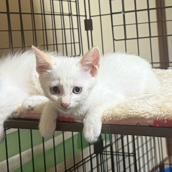 | 特徴(性格など) | まだまだ人馴れ修行中! 怖がりさんですが、比較的触れます。 白猫かと思いきや、お耳や尻尾などいずれ茶色が濃く出てくるかもしれません。青い目のイケメンくんです♡ お留守番短め(5時間程度)のお家希望、 きちんと脱走対策を講じてくださる方。必要な医療にかけて下さる方を希望致します。 |