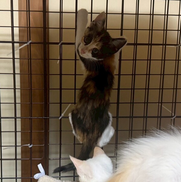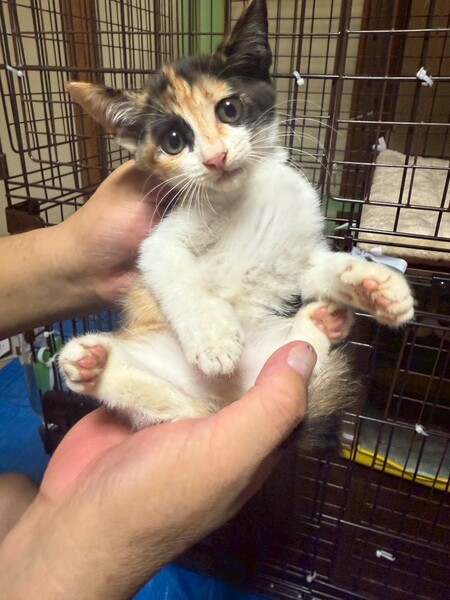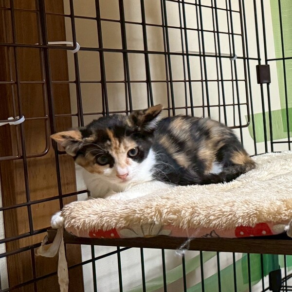 | 特徴(性格など) | まだまだ人馴れ修行中。怖がりさんです。 お顔は隈取り柄の濃い三毛ちゃん!! 個性的な柄でまさにオンリーにゃんです♡ お留守番短め(5時間程度)のお家希望、 きちんと脱走対策を講じてくださる方。必要な医療にかけて下さる方を希望致します。 |