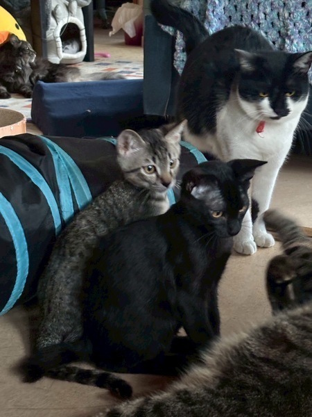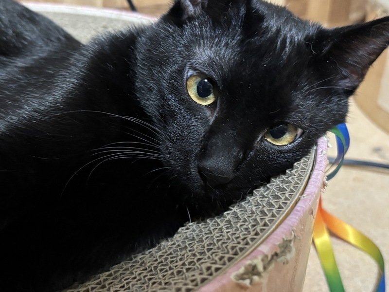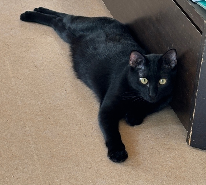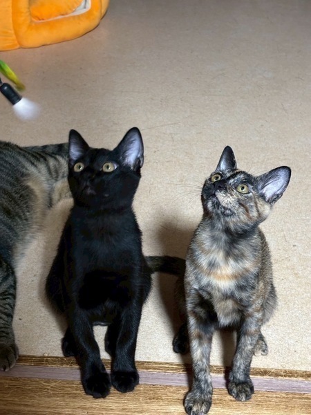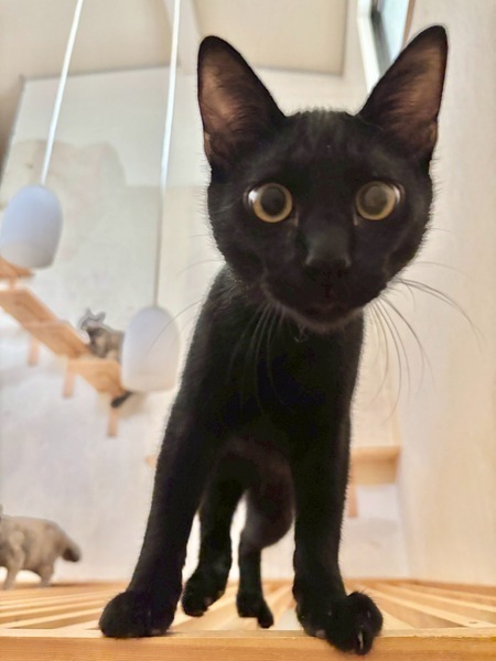 | 特徴(性格など) | 綺麗な真っ黒な黒猫さん 短尾の鍵しっぽ。 すごく怖がりですが、おやつやおもちゃで呼べば触れますし近くにきます。近くに来た時、寝起きは抱っこできます。 ただ、スタートダッシュが遅くて遊び始めものんびりスタート。甘えん坊。 |